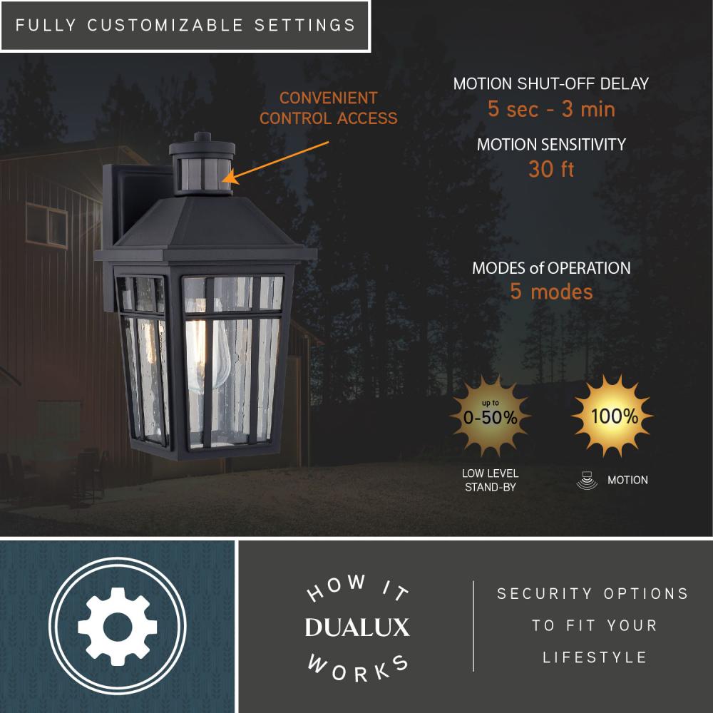 Dusk to dawn photo cell automatically turns fixture on in the dark and off in the light for added safety and security, saving energy during daylight hours