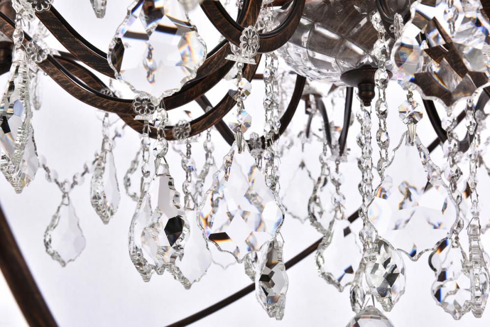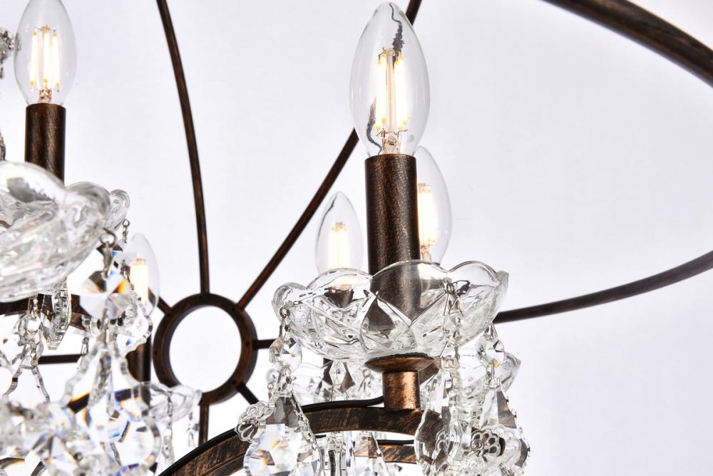 Royal-cut clear crystals and 18 candelabras create a dramatic contrast with the dark-bronze finish