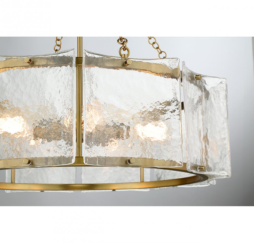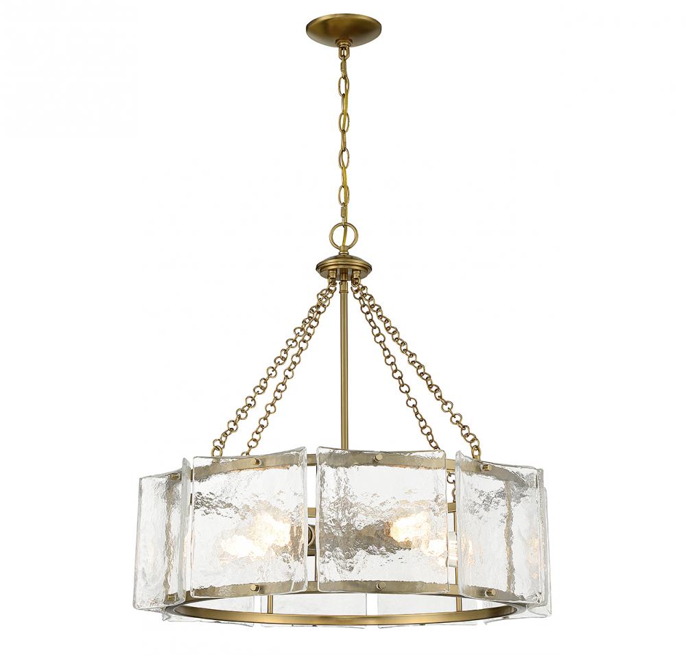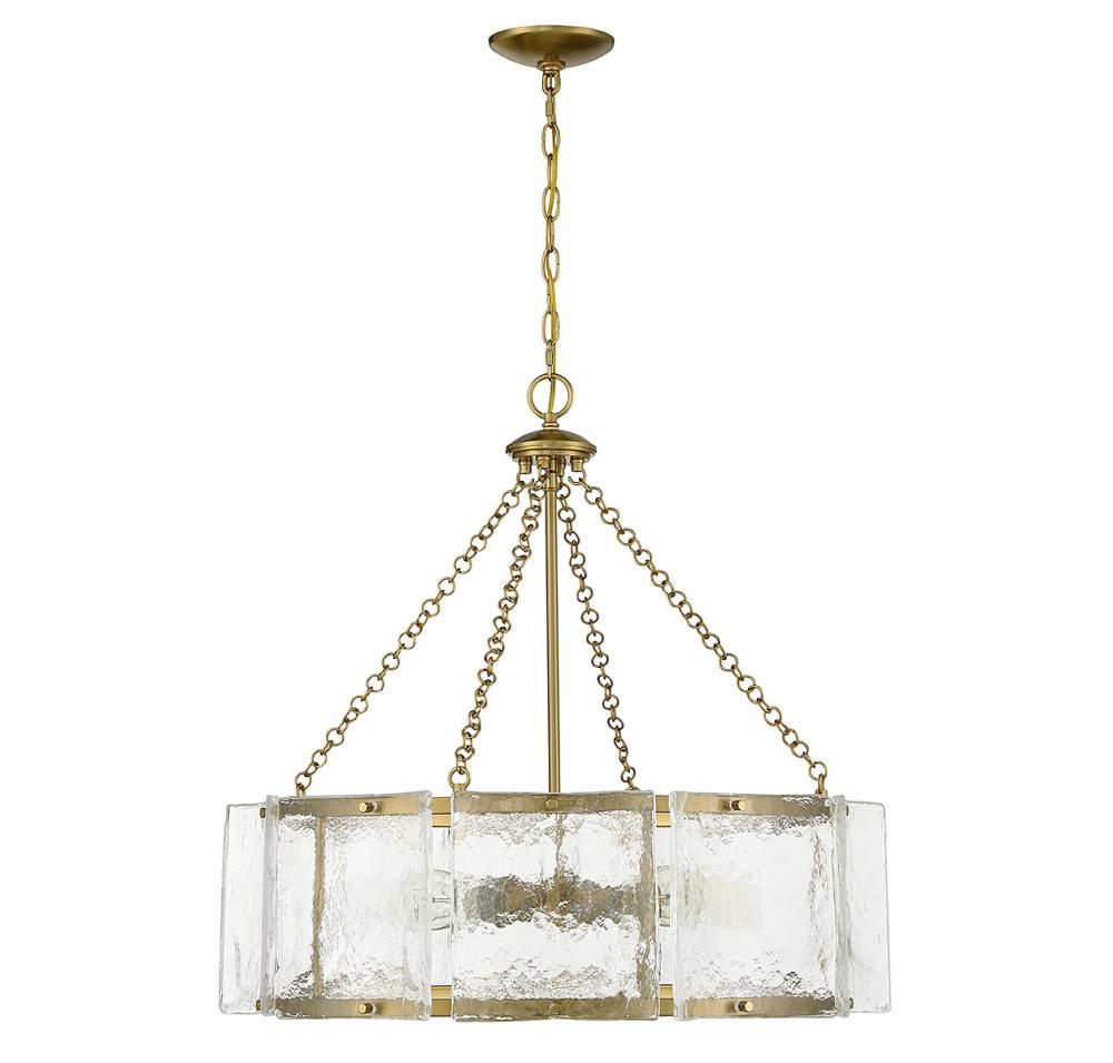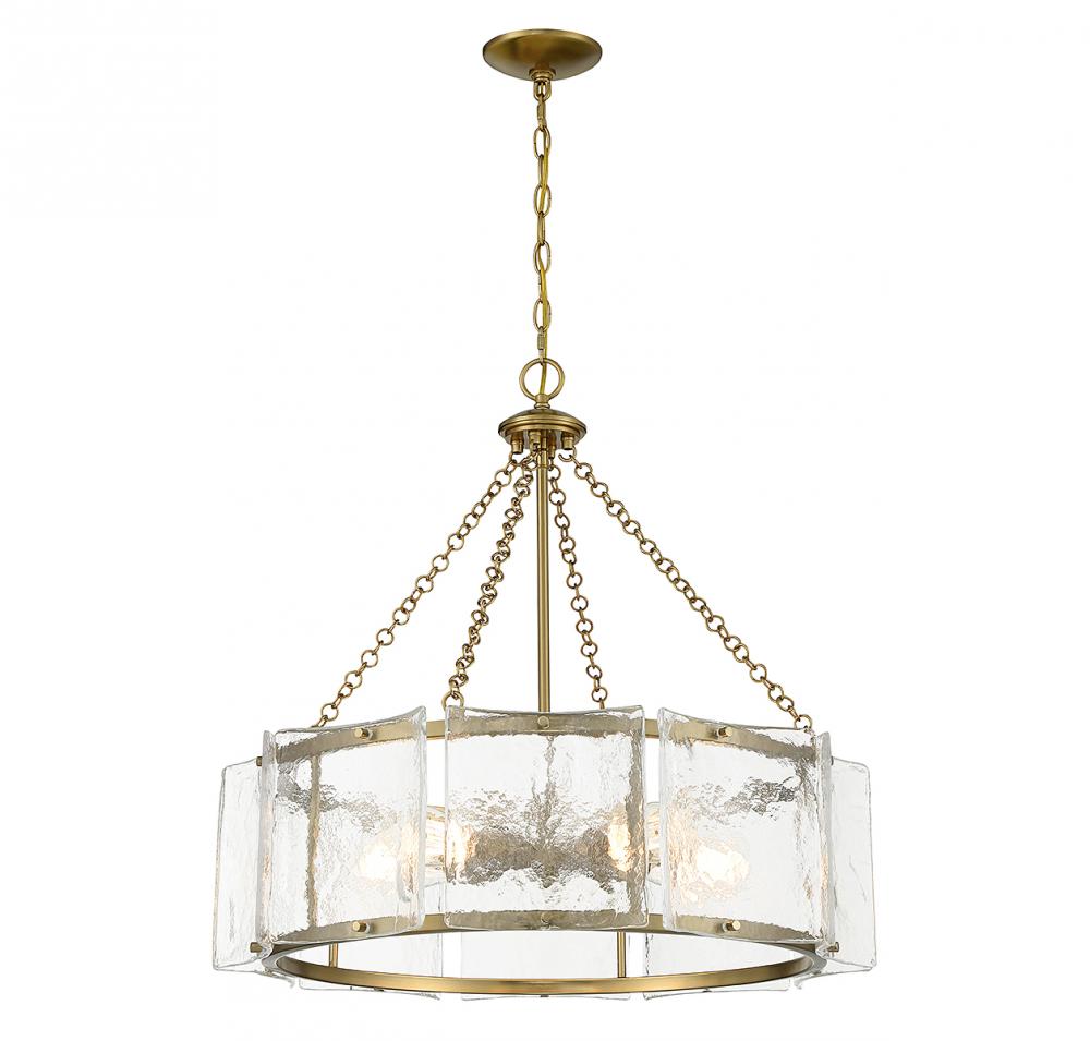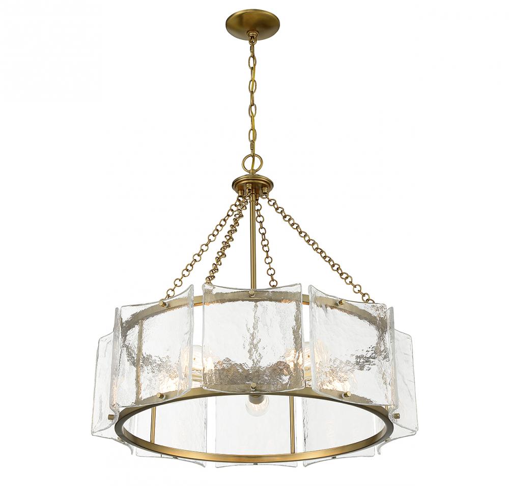 Bring a beautiful ocean-inspired lighting look to your home with the Savoy House Genry 5-light pendant. It is decorated with rippling panes of handmade glass and finished in warm brass. Genry is 25.5" in height and 26" in width. It uses 5 standard size bulbs of up to 60 watts per bulb (bulbs not included).