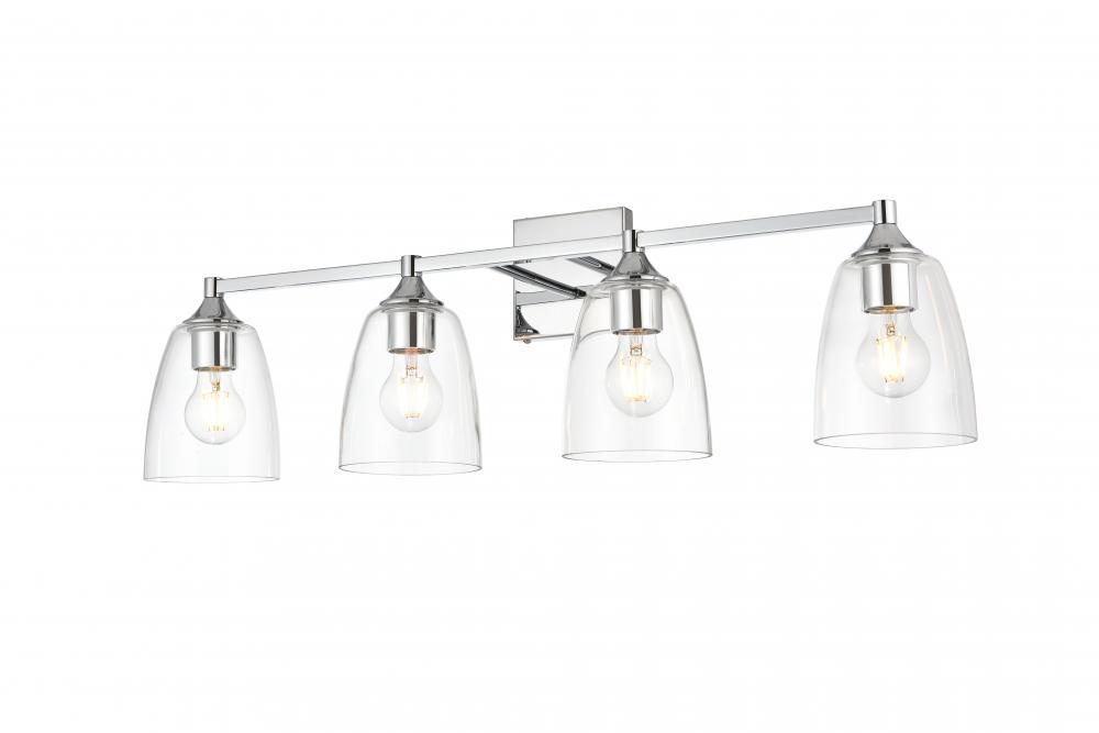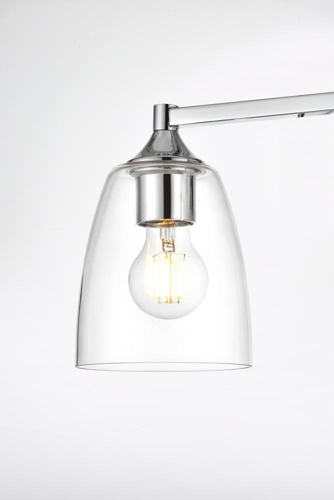 Defined by a sleek metal arm extends to suspend the clear tapered glass shade. A contemporary stunner, it shows off the straight line details from the backplate and the streamline thick metal arm. Compatible with dimmers, so you'll have the right amount of light in any given time of the day. Completely versatile, you can place this wall light as an uplight or downlight. Rated for use in damp locations, this will work perfectly over a vanity in your bathroom.