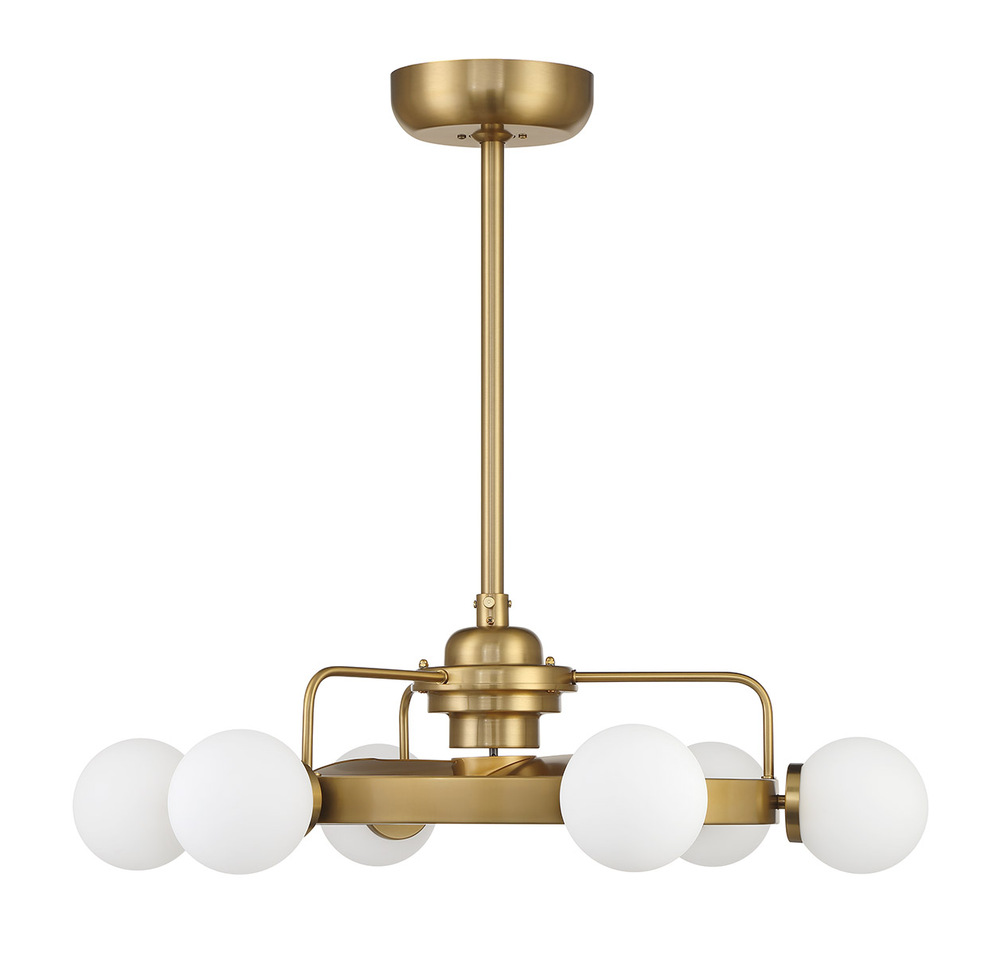 The ultra-cool Savoy House Gibson 6-light Fan D'Lier brings a touch of midcentury modern pop to any room with its globes of opal glass and its Warm Brass finish. Integrated, dimmable LED light brings bright and useful light while the DC motor brings efficiency. A handheld remote control is included for extra convenience. Gibson is 30" in width and 10" in height. Comes with a 4" downrod and an 18" downrod. Fan D'Liers are a Savoy House exclusive that combines the best of ceiling fans with the best of chandeliers in one fabulously fashionable fixture. These custom designs are inspired by high-end designer styles and take top trends to a whole new level.