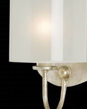 Mysterious in its opacity, the frosted glass shade of the Glacier Silver Wall Sconce releases its illumination softly. Adding to its subdued appeal is the simplicity of its lines and the silver leaf finish on its wrought iron frame. This glass wall sconce is certified for damp locations.