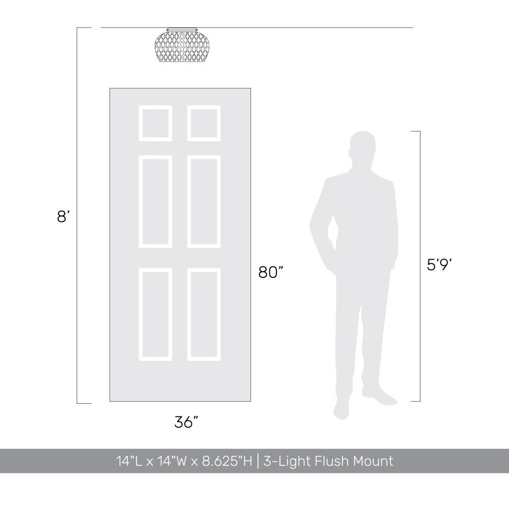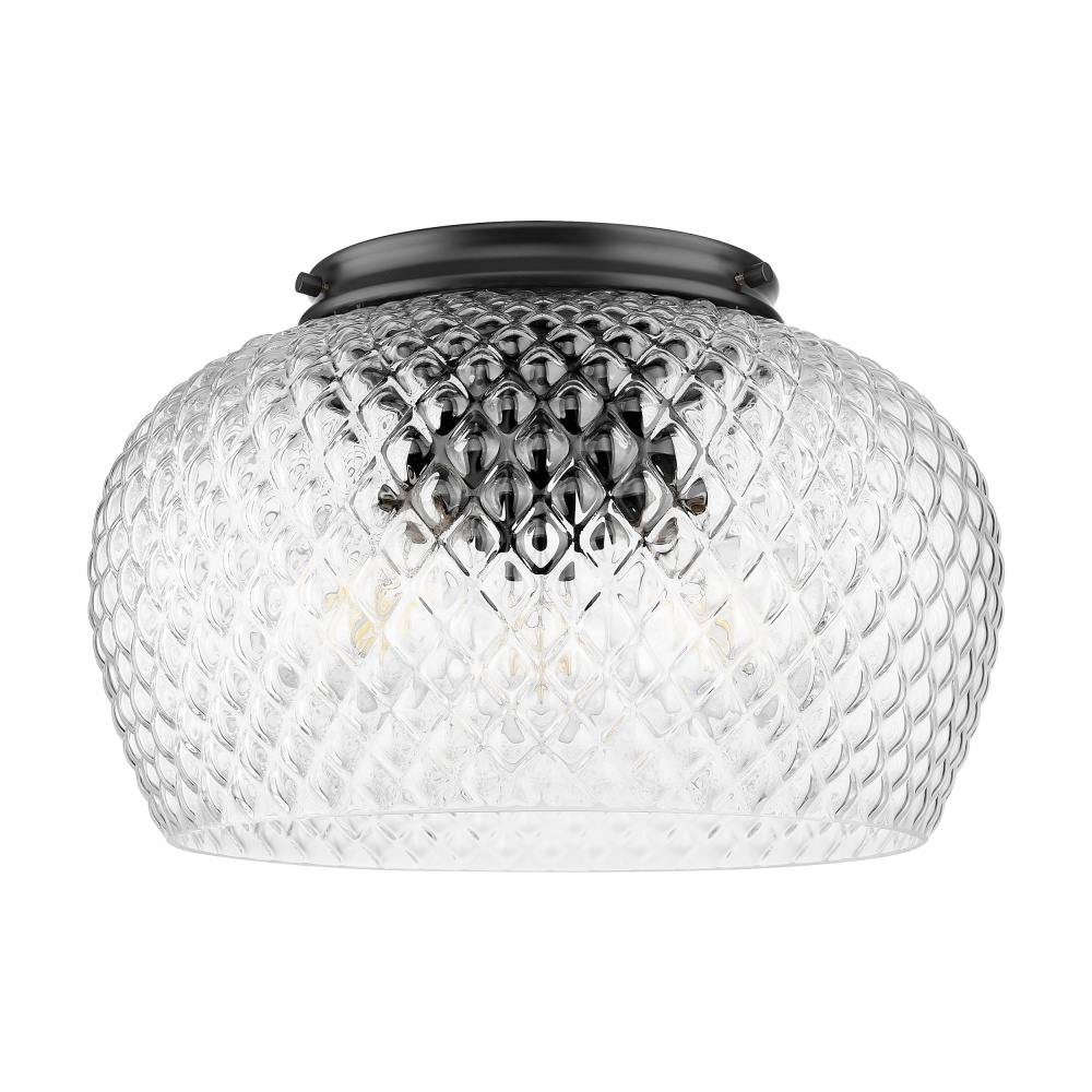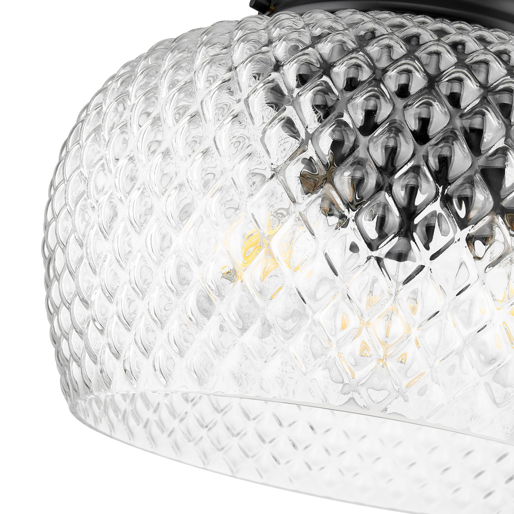 Elevate your space with the inviting farmhouse elegance of the Golden Lighting Adeline 3-light Flush Mount. Featuring a glass shade and a Matte Black frame, it creates a welcoming atmosphere throughout your home. The clear glass shade offers brilliant, unobstructed light, enhancing the cozy feel of this fixture. Textured glass shaped by skilled craftsmanship complements its sophisticated design, ensuring high-quality illumination for any area. The Matte Black finish is timeless, boasting a non-reflective surface that absorbs light while allowing the fixture to blend effortlessly with a variety of decors, from industrial to contemporary. This flush mount is perfect for low ceilings in hallways, closets, bathrooms, and more, rated for damp locations, making it suitable for spaces with occasional moisture. With overall dimensions of 14"W x 8.63"H x 14"D, it requires three E26 medium base bulbs (not included), with a maximum wattage of 60 per bulb. Bring charm and sophistication to your home with this quality fixture that promises to illuminate your surroundings beautifully.