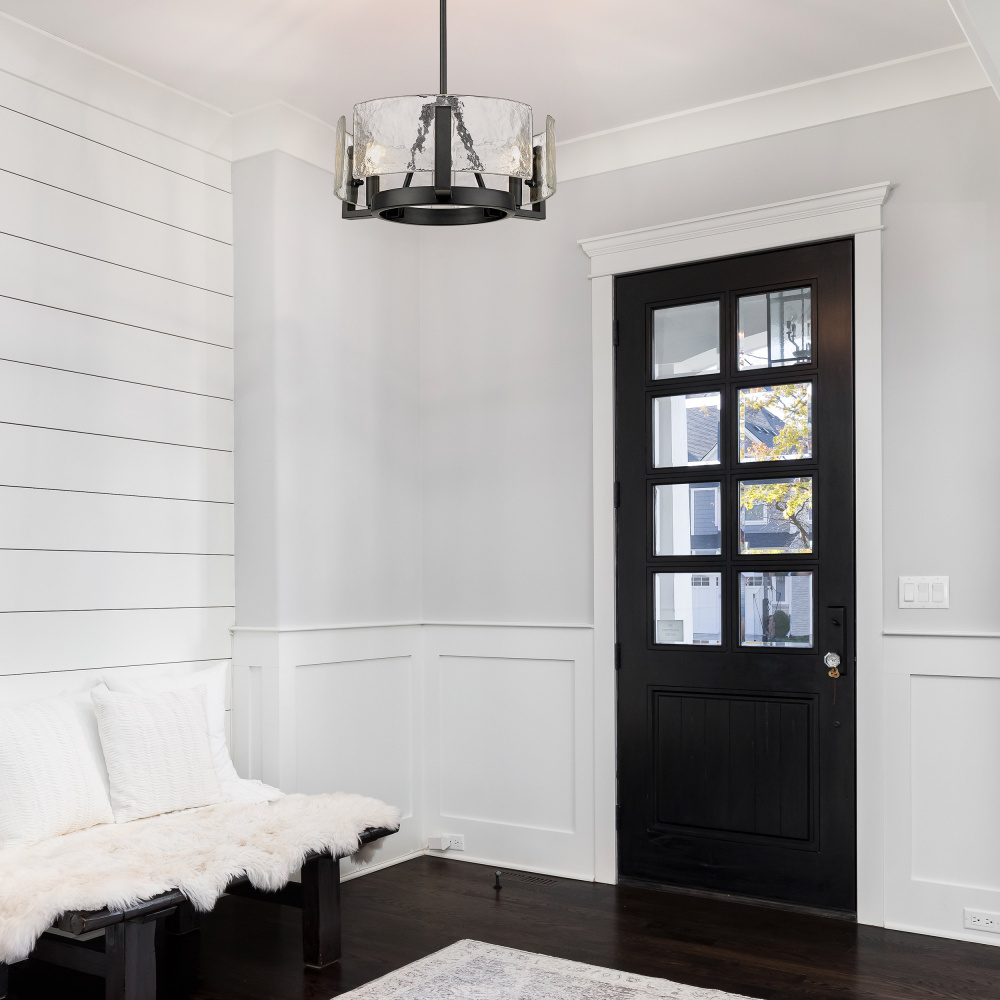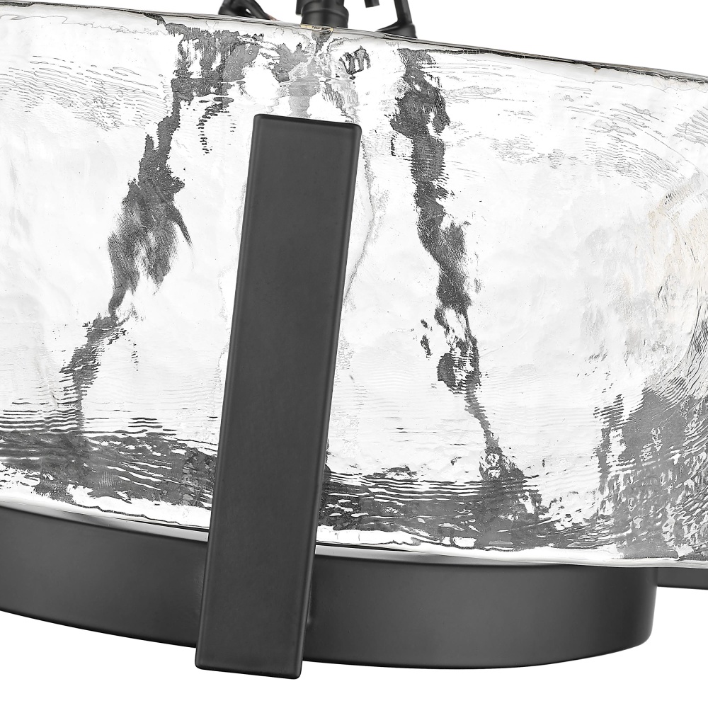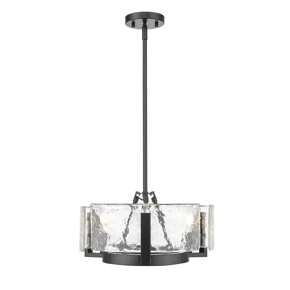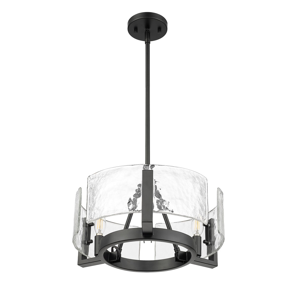 Make a striking statement in your home with the Golden Lighting Aenon 3-light Chandelier in Matte Black. Featuring a glass shade and a matte black frame, it creates a welcoming atmosphere. The hammered water glass shade, known for its rich, rippled texture, captures the essence of natural elements like ice and water, beautifully refracting light to cast unique patterns throughout your space. The matte black finish epitomizes clean, modern style, offering timeless versatility that complements various decor styles. Designed for versatile applications, this chandelier is damp location rated, making it suitable for covered and semi-enclosed spaces such as bathrooms, covered porches, and laundry rooms. The convertible design features adjustable hanging heights from 10.75" to 58", accommodating both flat and sloped ceilings effortlessly. Overall dimensions measure 16.5"W x 8.38"H x 16.5"D, requiring 3 E12 candelabra base bulbs (not included) with a maximum wattage of 60 per bulb. Elevate your decor with quality craftsmanship and the artisanal details of this stunning fixture that adds elegance and warmth to any setting.
