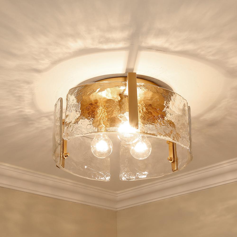 Bring nature-inspired elegance into your home with the Golden Lighting Aenon 3-light Flush Mount. Featuring a glass shade and a brushed champagne brass frame, it creates a welcoming atmosphere. The glass shade showcases a hammered water glass design, featuring a heavy, irregular texture crafted to create beautifully distorted and refractive light effects, capturing the dynamic essence of ice and water. The brushed champagne brass finish offers an understated elegance, blending warmth with a soft sheen that beautifully catches light. Ideal for low ceilings in hallways, closets, laundry areas, and bathrooms, this fixture is damp location rated for covered and semi-enclosed spaces with occasional moisture. It requires 3 E26 medium base bulbs (not included), with a maximum wattage of 60 per bulb. Overall Dimensions: 15"W x 6.88"H x 15"D. Elevate your space with the quality craftsmanship and artistic details of this stunning flush mount light.