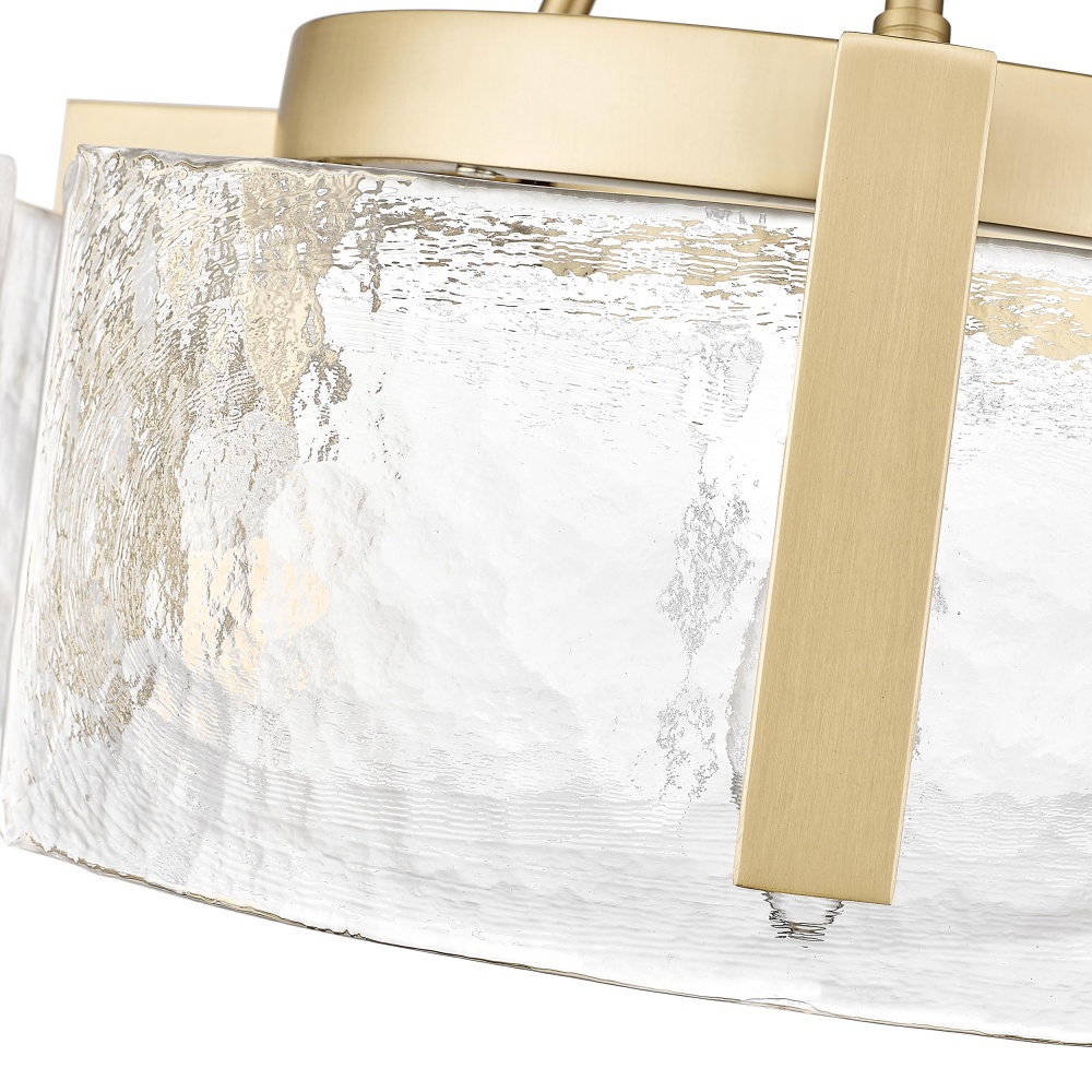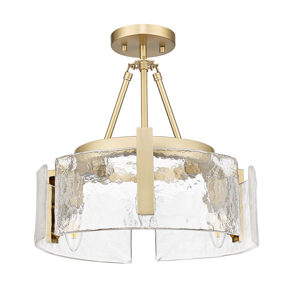 Add a touch of nature-inspired elegance to your home with the Golden Lighting Aenon 3-light Semi-Flush Mount in Brushed Champagne Brass. Featuring a glass shade, it creates warm and inviting illumination. The hammered water glass shade beautifully distorts and refracts light, adding an organic feel to your space. With a brushed champagne brass finish, this fixture offers a chic alternative to traditional gold, blending warmth with sophistication and reflecting light for a soft sheen that enhances any modern decor. This semi-flush mount is versatile for use in entryways, kitchens, and living areas, boasting a damp location rating for spaces with occasional moisture. Its convertible design allows for both semi-flush mount and pendant installation, with an adjustable height (Min: 10"- Max: 15.25") to suit your preferences. Overall dimensions are 16.5"W x 10"H x 16.5"D, and it requires three E12 candelabra base bulbs (not included), with a maximum wattage of 60 per bulb. The Aenon fixture not only illuminates but also embodies quality craftsmanship, creating a stunning focal point in your home.