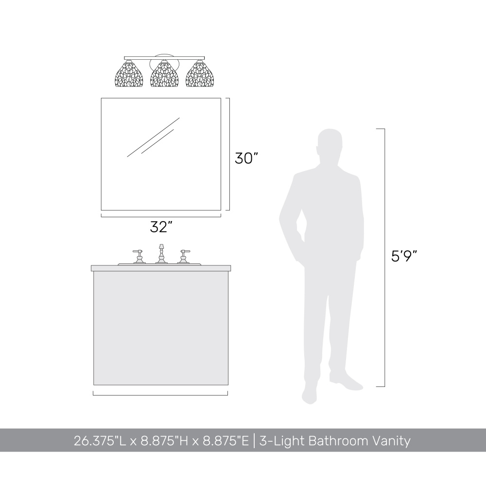 Bring transitional elegance into your home with the Golden Lighting Ariella 3-light Vanity in Matte Black. Featuring a glass shade and a matte black frame, it creates a welcoming atmosphere. The stunning glass shade with a hammered texture beautifully refracts light, casting a sparkling glow while the clear glass retains a clean design. The matte black finish provides a timeless and versatile backdrop, complementing a variety of decor styles, from minimalist to contemporary. Perfect for brightening bathrooms with dedicated lighting that flatters while providing practical task illumination, this fixture is damp location rated, making it ideal for covered spaces. Overall Dimensions: 26.38"W x 8.88"H x 8.88"D. Requires 3 E26 Medium base bulbs (not included). Max 60 wattage per bulb. Elevate your bathroom's aesthetic with a fixture that blends quality and functionality seamlessly.