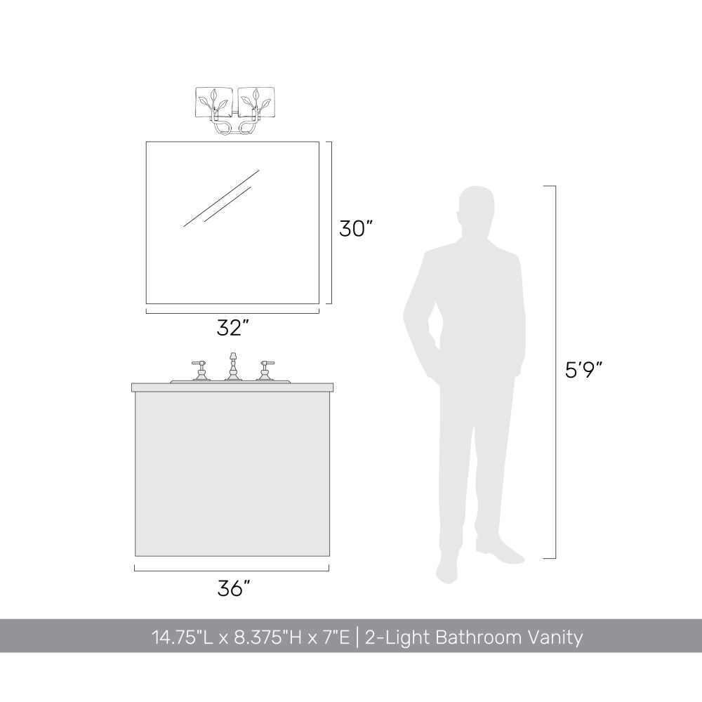 Bring nature-inspired elegance into your home with the Golden Lighting Calla 2-light Vanity in Peruvian Silver. Featuring a glass shade and a Peruvian Silver frame, it creates a welcoming atmosphere. This glass shade showcases hammered water glass, creating beautifully distorted and refractive light effects that enhance the visual appeal. The finish, inspired by ancient silver, exudes a warm and rustic charm, with a hand-brushed texture that offers a distinguished glow. Brighten up bathrooms with dedicated lighting that flatters while providing practical task illumination, perfect for damp locations such as bathrooms and laundry rooms. Requires 2 E26 Medium base bulbs (not included) with a maximum of 60 watts each. Overall dimensions are 14.75"W x 8.38"H x 7"D. Elevate your bathroom space with this timeless piece, emphasizing quality and unique artistry.