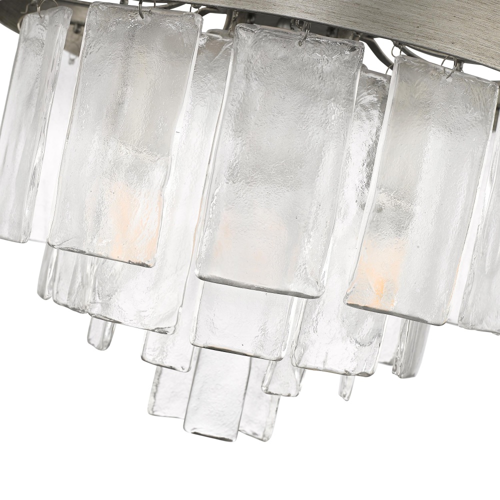 Transform your space with the Golden Lighting Ciara 3-light Flush Mount. Featuring a glass shade and a Peruvian Silver frame, it creates a welcoming atmosphere. The hammered water glass shade captures the essence of nature, producing a beautifully distorted light effect that dances across your walls. Crafted with intricate detail, the finish features a muted, weathered silver that adds a rustic elegance to any space. This fixture is ideal for low ceilings in hallways, closets, laundry areas, bathrooms, and more, and is damp location rated for occasional moisture. Installation is straightforward with dimensions of 13"W x 10"H x 13"D, and it requires 3 E12 candelabra base bulbs (not included), with a maximum wattage of 60. The artisanal quality and timeless design of this fixture make it a stunning choice for your home.