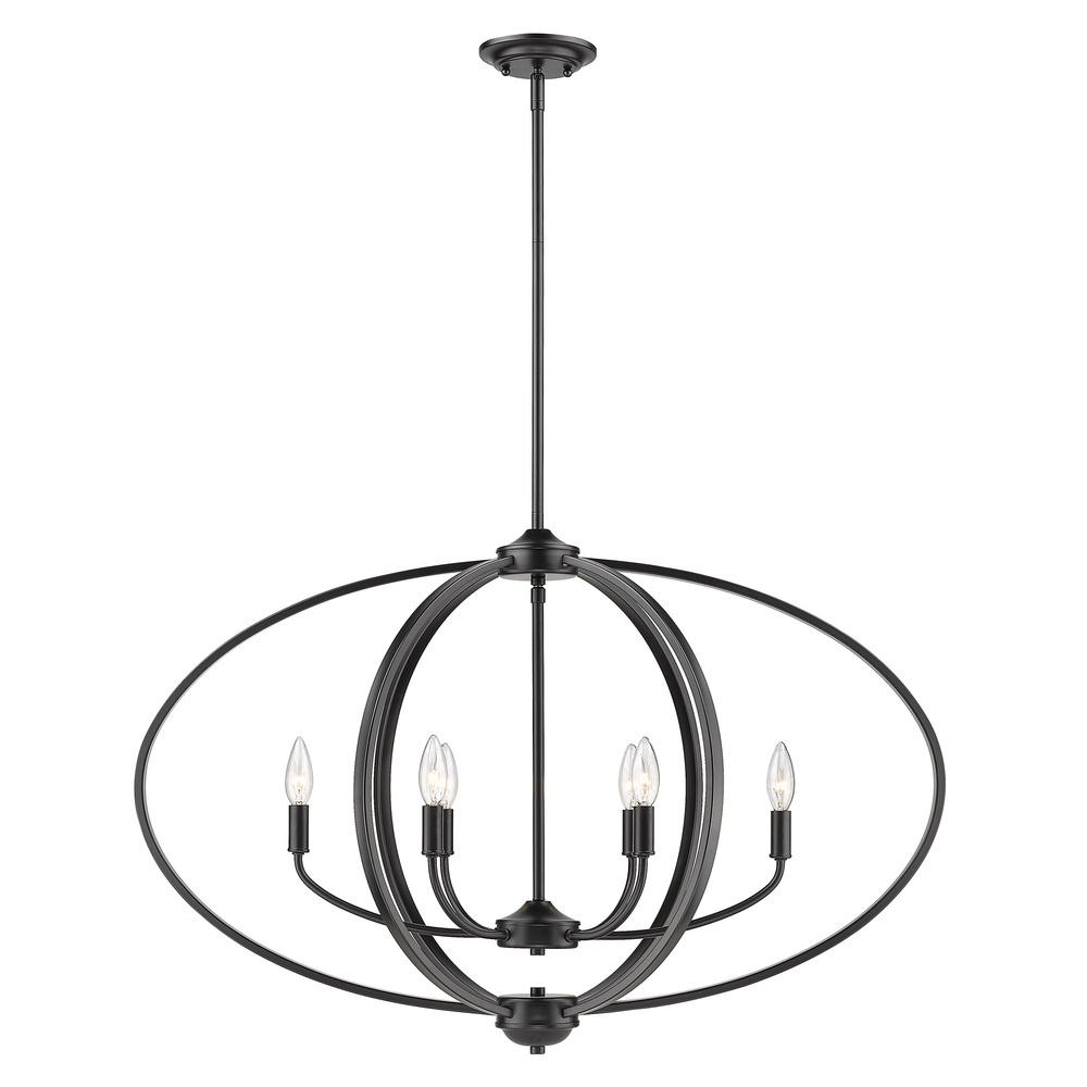 Bring Modern elegance into your home with the Golden Lighting Colson 6-light Island Light in Matte Black. This striking fixture brings utility and flair to kitchen islands or dining areas. Sporting a clean, open-orb frame, this suspended light features a timeless candelabra design that creates a sophisticated statement piece. The Matte Black finish is smooth to the touch, adding a refined elegance to your décor. Rated for dry locations, it is perfect for indoor spaces like bedrooms and living rooms. The adjustable height feature allows for a minimum hanging length of 25.875" and a maximum of 67.875", accommodating various ceiling heights. Overall dimensions are 35"W x 23.25"H x 13"D, and it requires 6 E12 Candelabra base bulbs (not included), with a maximum wattage of 60 per bulb. Elevate your home with this remarkable island light, combining modern style with functional lighting to effortlessly illuminate your gatherings.