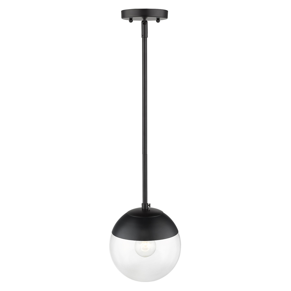 Bring Mid-Century Modern elegance into your home with the Golden Lighting Dixon 1-light Pendant in Matte Black. Featuring a glass shade and a Matte Black frame, it creates a welcoming atmosphere. The clear glass shade allows brilliant, unobstructed light to shine through, while the Matte Black finish offers a sleek, sophisticated look that complements any decor. This pendant is suitable for covered and semi-enclosed spaces, and its convertible design allows for installation as either a semi-flush mount or pendant. Height is adjustable from 16.375" to 52.375". Overall dimensions are 7.75"W x 13.75"H x 7.75"D, requiring 1 E26 Medium base bulb (not included) with a maximum wattage of 60. Enjoy a seamless blend of style and versatility.