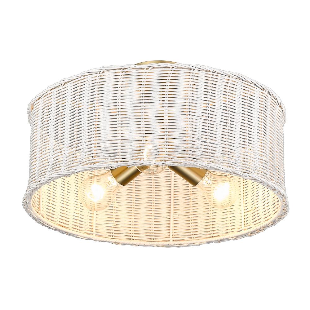 Bring coastal elegance into your home with the Golden Lighting Erma 3-light Semi-Flush Mount. Featuring a wicker shade and a brushed champagne brass frame, it creates a welcoming atmosphere. The white wicker shade provides a light and airy feel, meticulously woven to create subtle interplay of light and shadow. The brushed champagne brass finish offers a chic, sophisticated alternative to traditional gold, while its satin sheen adds a touch of quiet luxury. Ideal for entryways, bedrooms, kitchens, and living areas with mid-height ceilings, this fixture is damp location rated for versatility. Requires 3 E26 Medium base bulbs (not included), max 100 watts per bulb. Overall dimensions are 16.38"W x 9.5"H x 16.38"D. Elevate your space with this stylish and functional light fixture that embodies modern coastal design.
