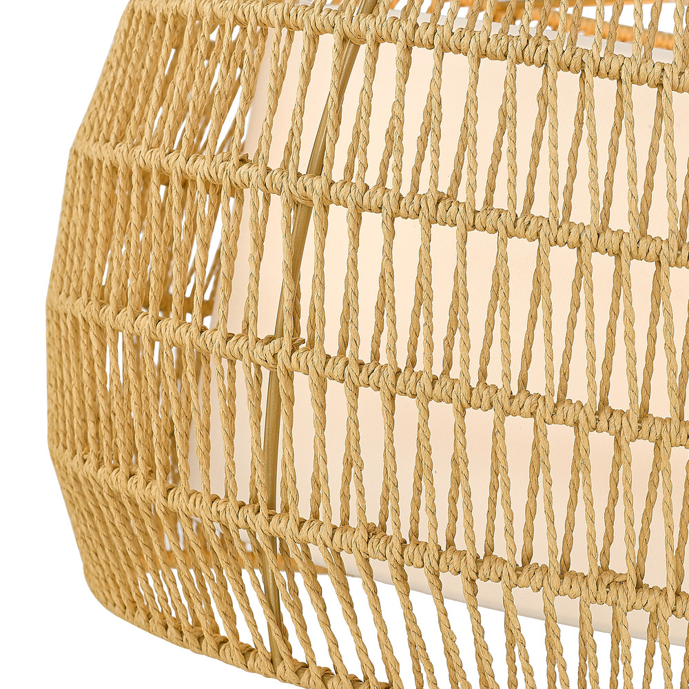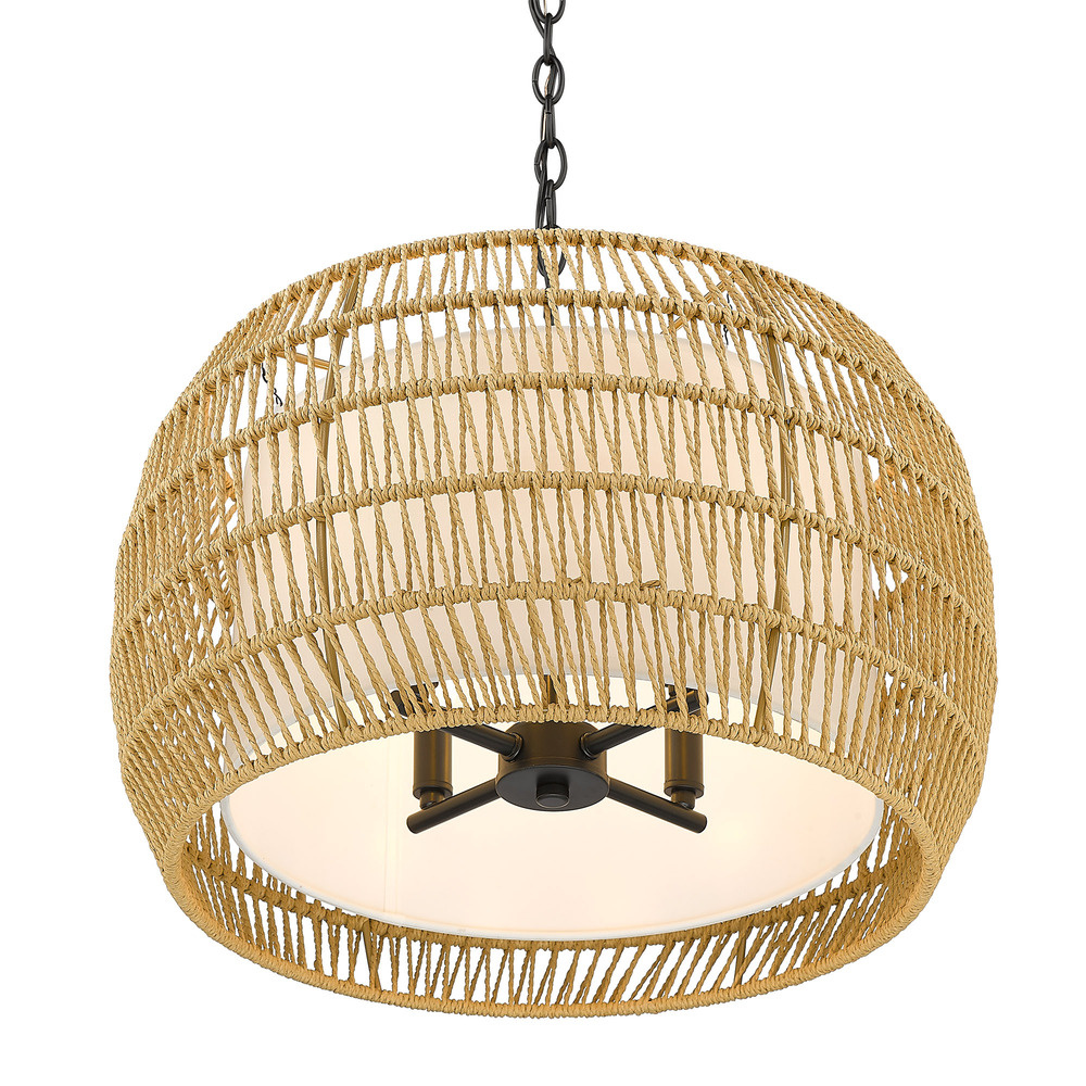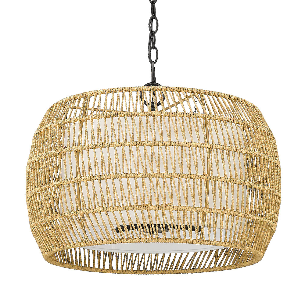 Bring Coastal elegance into your home with the Golden Lighting Everly 4-light Pendant. Featuring a Wicker shade and a Matte Black frame, it creates a welcoming atmosphere. The handwoven Wicker shade, crafted from Natural Rattan, adds a light, airy touch while enhancing your space’s organic texture. Embrace the raw beauty of natural materials and enjoy the interplay of light it provides. Our Matte Black finish is timeless and versatile, offering a sophisticated look with its deep, non-reflective surface that absorbs light, making it perfect for any decor. Ideal for kitchens, dining rooms, or entryways, this Damp Location Rated fixture suits covered spaces. The adjustable height feature allows for customized installation, accommodating sloped ceilings. Dimensions: 19"W x 13.5"H x 19"D. Requires 4 E12 Candelabra base bulbs (not included), max 60 watts. Quality craftsmanship and a cohesive design create a statement piece that enhances your home’s aesthetic.