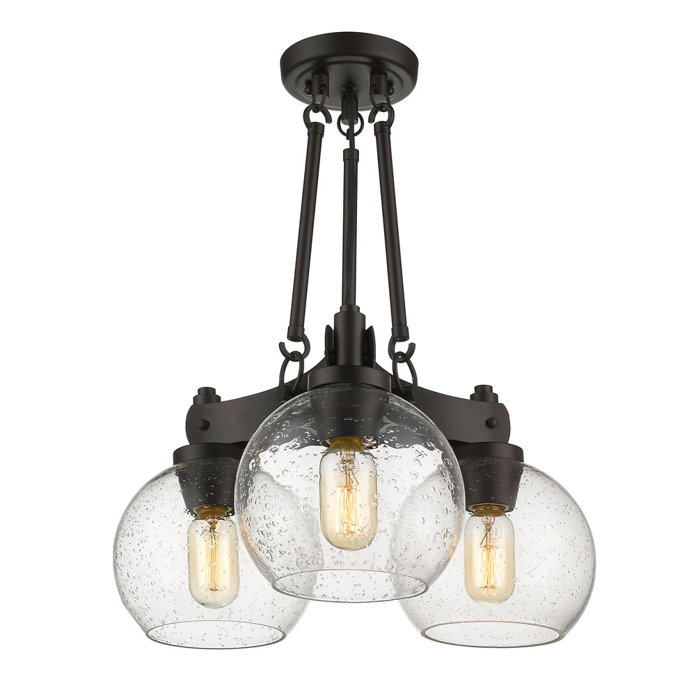 Bring timeless charm into your home with the Golden Lighting Galveston 3-light Semi-Flush Mount. Featuring a glass shade and a rubbed bronze frame, it creates a welcoming atmosphere that complements various styles. The seeded glass shade adds vintage character, catching the light with tiny bubbles that sparkle and diffuse the illumination beautifully. This rubbed bronze finish presents a rich, deep brown base, skillfully brushed for warm highlights that exude warmth and sophistication. Designed for versatile application, this fixture is perfect for indoor spaces not subject to moisture such as living rooms and hallways. It's adjustable height ranges from 14" to 20" and is sloped-ceiling compatible for easy installation. Overall dimensions are 18"W x 14"H x 18"D, requiring 3 E26 medium base bulbs (not included) with a max wattage of 60 per bulb, ensuring bright, inviting light. Elevate your space with the blend of style and function that the Golden Lighting Galveston fixture offers.