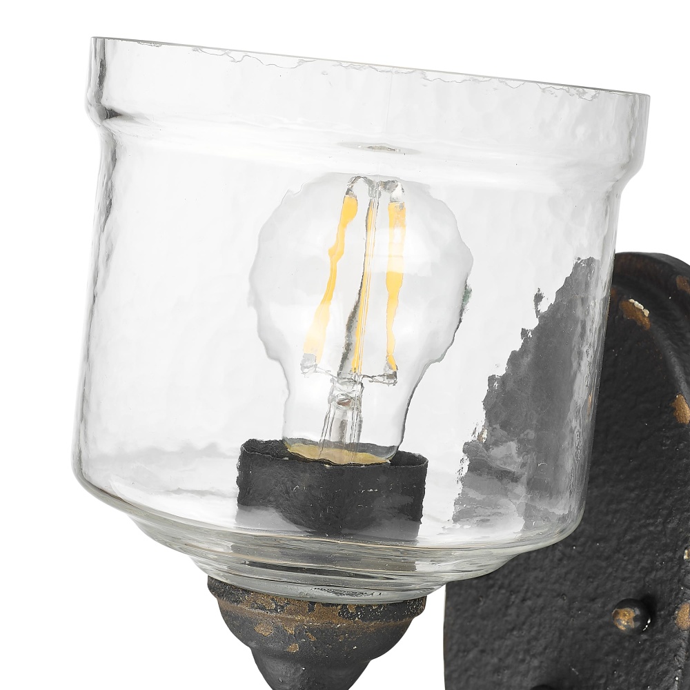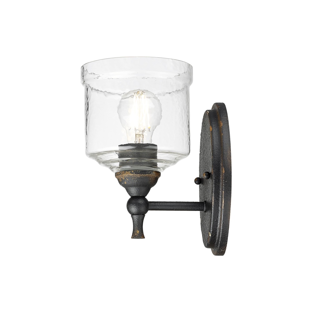 Bring farmhouse elegance into your home with the Golden Lighting Keating 1-light Wall Sconce. Featuring a glass shade and an antique black iron frame, it creates a welcoming atmosphere. The glass shade beautifully distorts and refracts light, showcasing a hammered water glass design that adds an artisanal touch to your decor. This Hammered Water Glass captures the dynamic essence of both ice and water, casting intricate patterns that enhance any space. The antique black iron finish tells a story of time and endurance, with a rugged, matte black layer that displays hints of an antiqued gold base beneath. Perfect for rustic and industrial designs, this finish brings a powerful statement of age and handcrafted character. Ideal for enhancing hallways, stairways, and bathrooms, this damp-location rated fixture is suitable for covered and semi-enclosed spaces with occasional moisture. Requires 1 E26 medium base bulb (not included) at a maximum of 100 watts. Overall dimensions are 5.88"W x 9.75"H x 7.5"D, making it a versatile addition to your lighting collection. Enjoy the cozy ambiance this wall sconce brings to your home, reflecting quality craftsmanship.