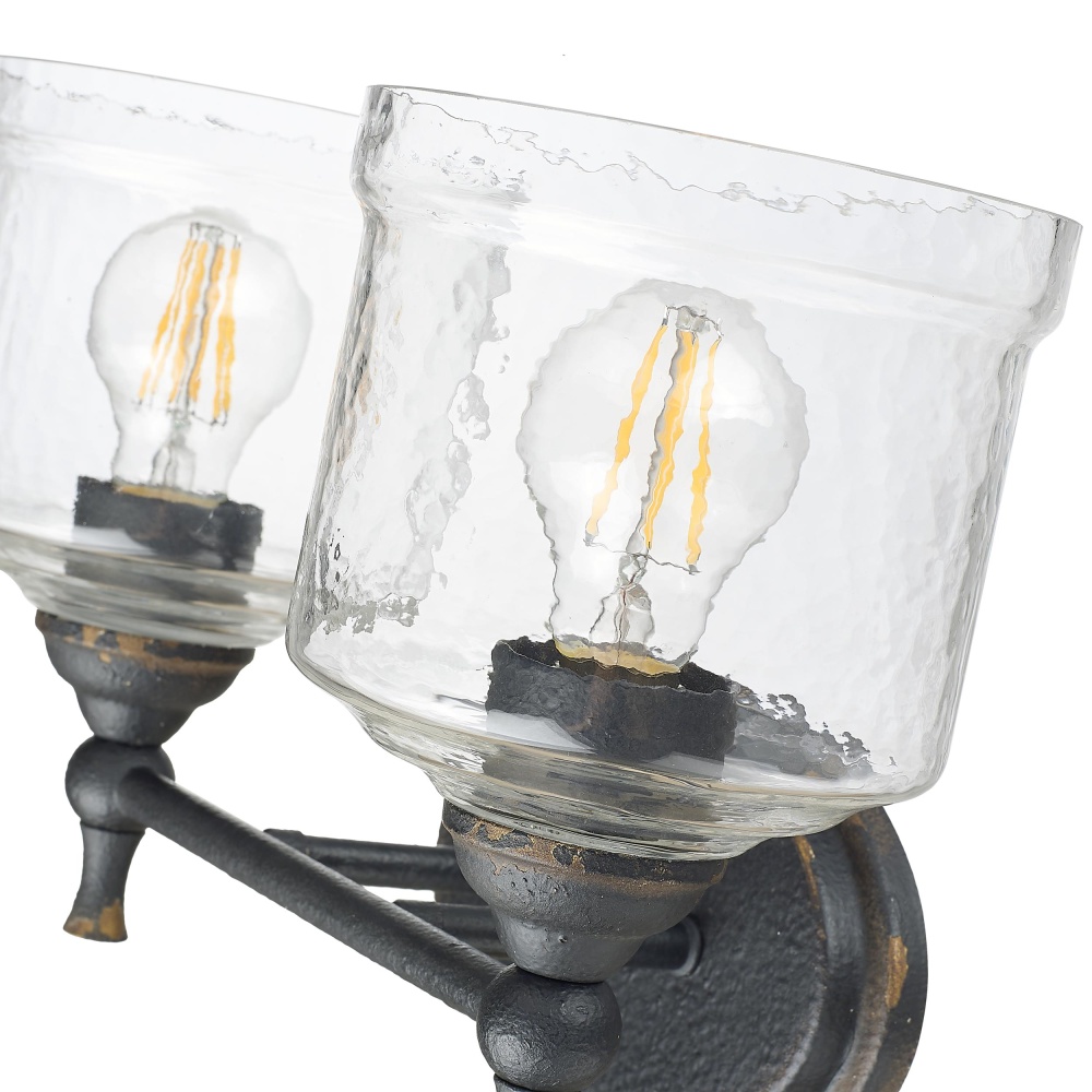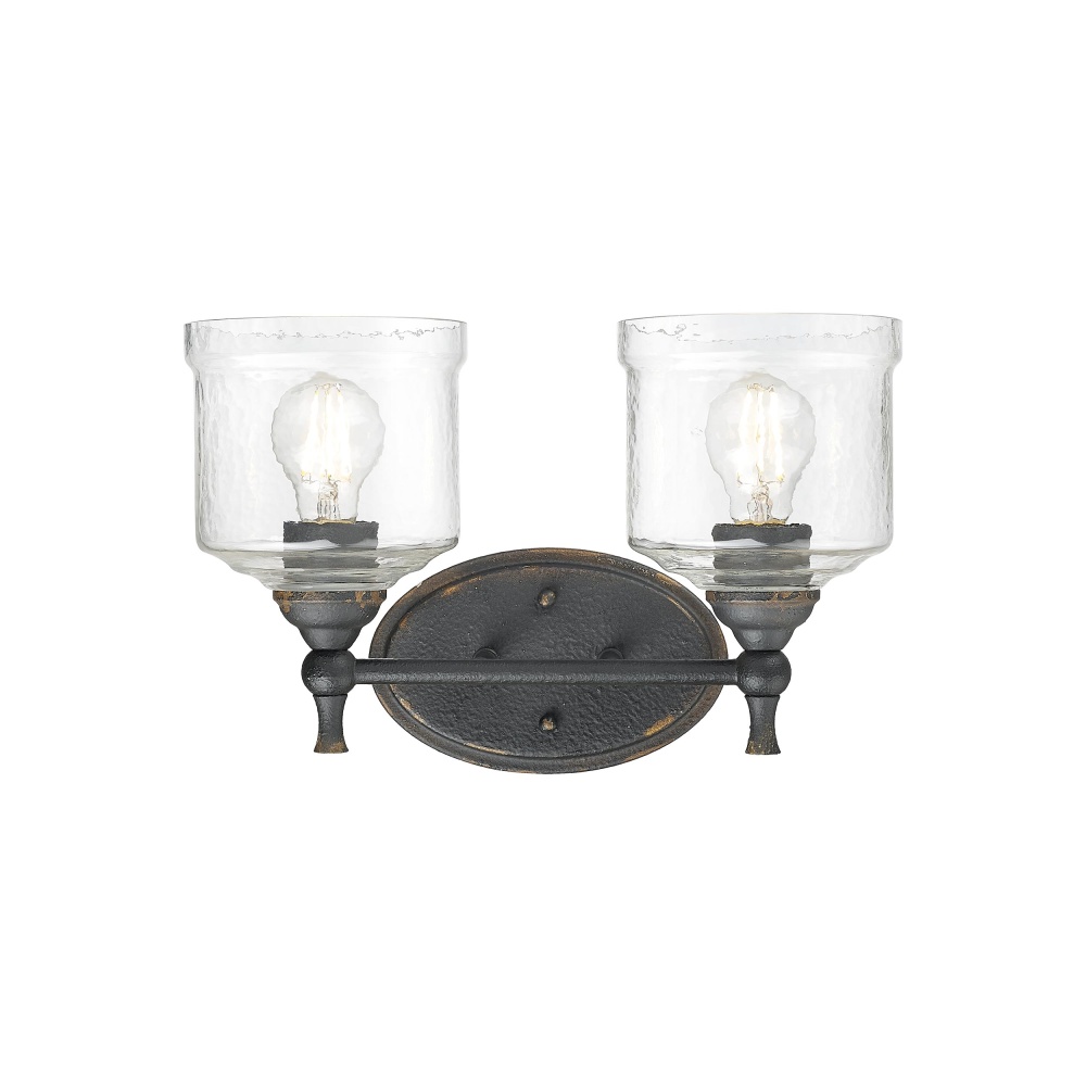 Elevate your space with a touch of rustic elegance, thanks to the Golden Lighting Keating 2-light Vanity. Featuring a glass shade and an antique black iron frame, it's perfect for creating a welcoming atmosphere in bathrooms. The glass shade showcases hammered water glass, lending itself to an enchanting light effect that beautifully refracts illumination in your home. Capturing the raw, authentic charm of a bygone era, the antique black iron finish tells a story of time, revealing glimpses of a warm, antiqued gold base beneath its textured surface. Designed for damp locations, this vanity light is suitable for bathrooms and other semi-enclosed spaces with occasional moisture. It requires 2 E26 Medium base bulbs (not included), with a maximum wattage of 100 per bulb. Overall Dimensions: 15"W x 9.75"H x 7.5"D, making it an ideal choice for any bathroom seeking style and practicality. Infuse your space with the artistry and craftsmanship you deserve.