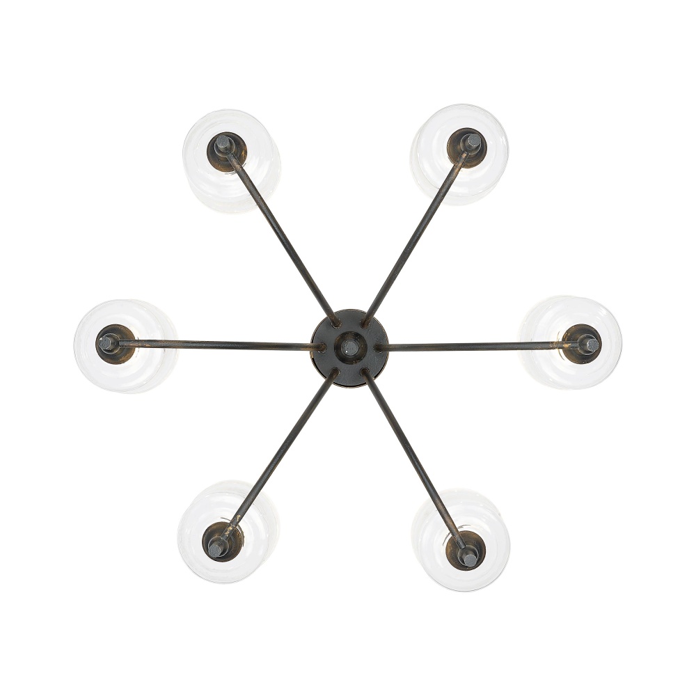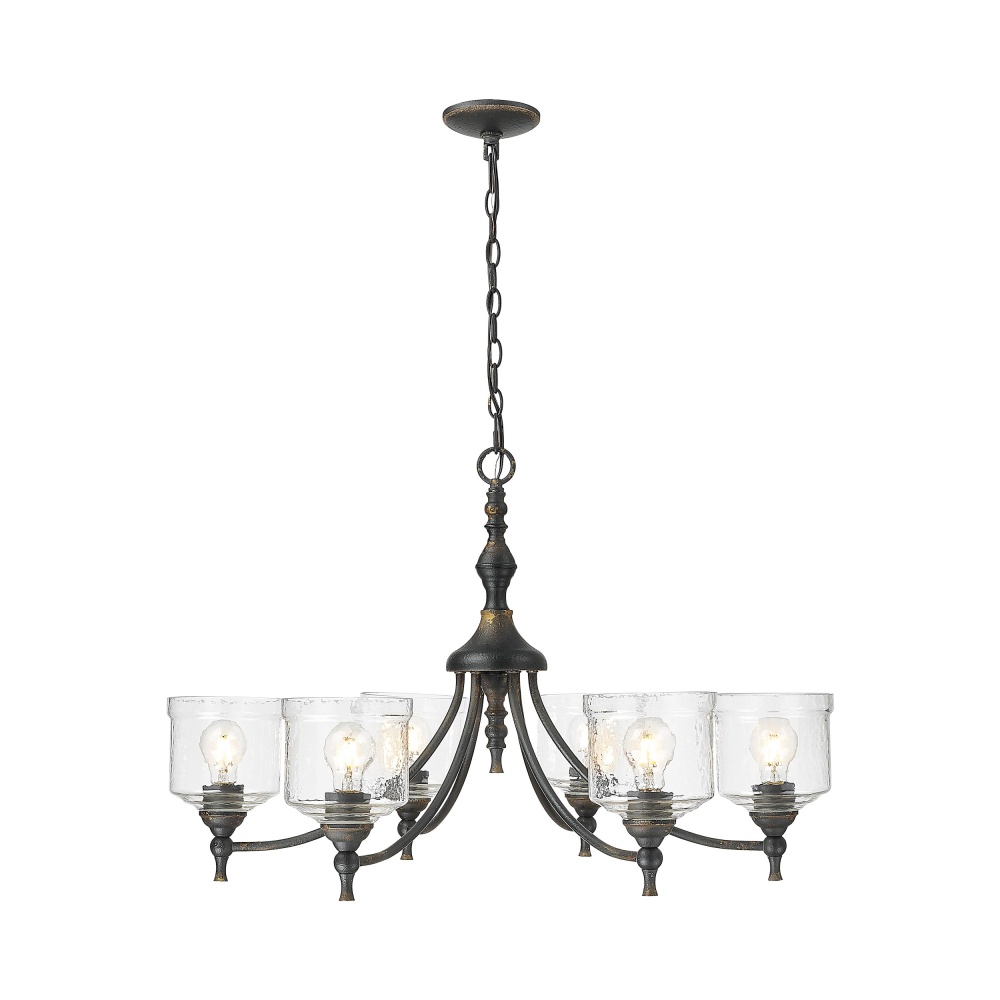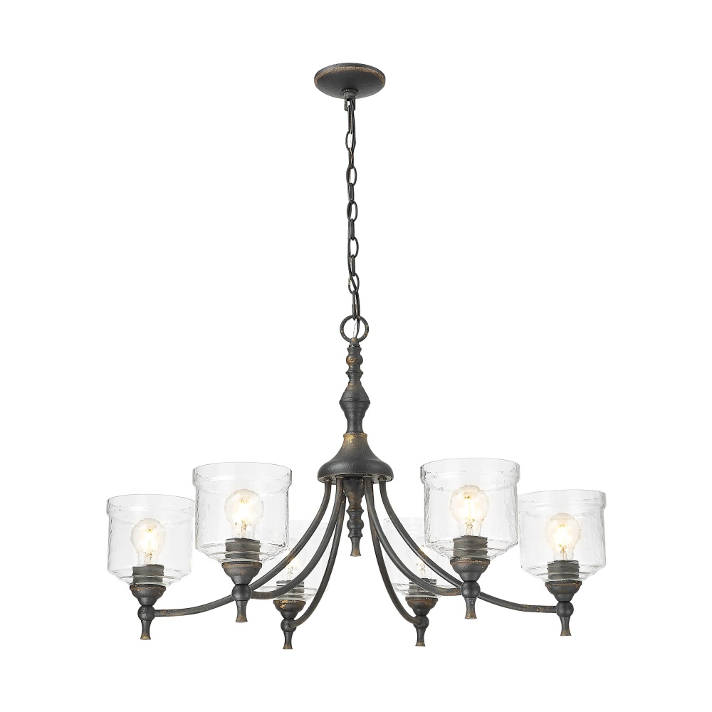 Bring industrial warmth into your home with the Golden Lighting Keating 6-light Chandelier. Featuring a glass shade and a captivating Antique Black Iron frame, it creates an inviting atmosphere. The hammered water glass shade offers a dynamic texture, which refracts light beautifully, casting intricate patterns to illuminate your space. Capture the raw, authentic charm of a bygone era with the Antique Black Iron finish, featuring a rugged, matte black layer artfully weathered to reveal glimpses of warm, antiqued gold underneath, adding a powerful statement of age and character. This chandelier makes a grand impression in dining rooms and foyers while elevating bedrooms and living spaces. Dry Location Rated, it is ideal for indoor spaces not subject to moisture, and it is easily installed on sloped ceilings with an adjustable height ranging from 24.625" to 98.25". Overall Dimensions: 33.5"W x 21.25"H x 33.5"D. Requires 6 E26 Medium base bulbs (not included), with a maximum wattage of 60 per bulb. Enhance your home décor with this exquisite, handcrafted piece that celebrates artistry and quality.