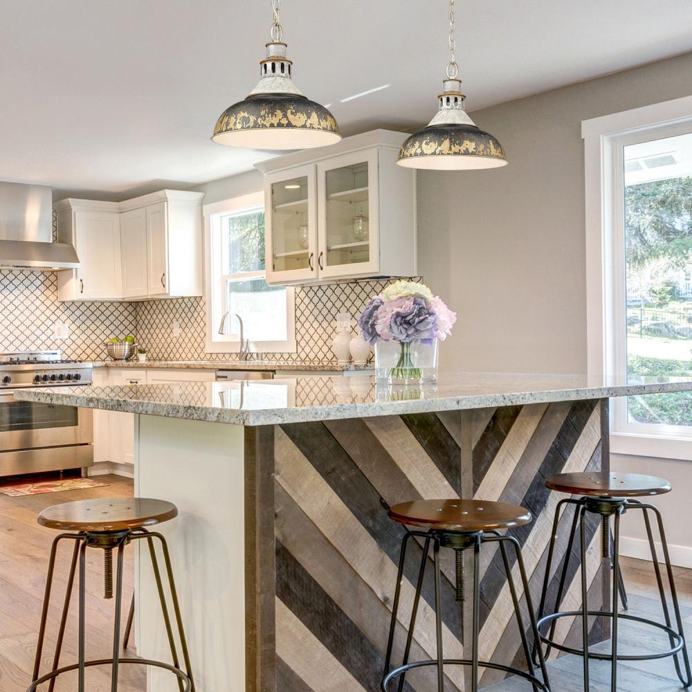 Bring timeless farmhouse elegance into your home with the Golden Lighting Kinsley 1-light Pendant in Antique Black Iron shade. Featuring a metal shade and an Aged Galvanized Steel frame, it creates a welcoming atmosphere. This metal shade showcases an Antique Black Iron finish characterized by a matte, charcoal-black top coat over an antiqued gold base, heavily distressed to reveal a compelling story of time. The Aged Galvanized Steel finish tells a powerful narrative of elements, composed of a cool gray layered with white, creating a dramatic texture rich with rustic tones. Ideal for kitchens, dining rooms, or bathrooms, this pendant light is damp location rated, making it suitable for covered and semi-enclosed areas. Installation is simple with its sloped-ceiling compatibility, and the adjustable height ranges from 16.75" to 88.75" for versatile placement. Overall dimensions measure 14"W x 13.38"H x 14"D, and it requires 1 E26 medium base bulb (not included) with a max wattage of 100. Infuse your space with charm and quality craftsmanship with this exquisite light fixture.