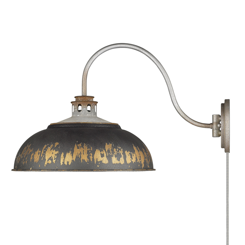 Infuse your space with character using the Golden Lighting Kinsley 1-light Swing Arm Wall Lamp. This piece marries rustic charm and functionality, featuring a metal shade and a vintage Antique Black Iron finish that exudes farmhouse elegance. The shade's textured surface displays the distressed beauty of weathered iron, enhancing its historical allure. The Aged Galvanized Steel finish completes the look, adding depth and authenticity to your décor. Suitable for Damp Locations, this lamp is perfect for covered porches or reading areas. The convenient swing arm allows you to position light precisely where needed, making it ideal for bedrooms or home offices. With overall dimensions of 14"W x 12.63"H x 21.5"D, it requires 1 E26 Medium base bulb (not included), with a maximum wattage of 100 per bulb. Enrich your home with this artisanal light fixture, a perfect blend of style and practicality.