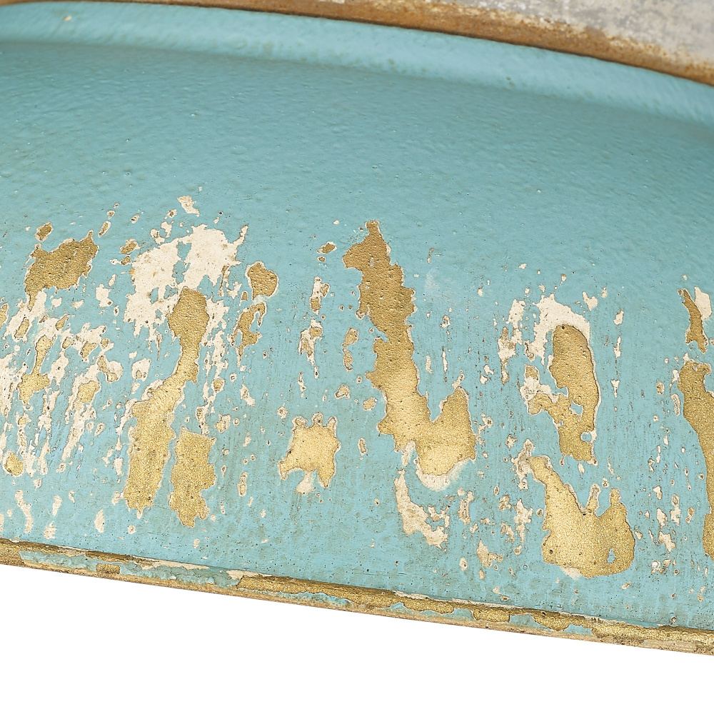Bring a touch of vintage charm into your home with the Golden Lighting Kinsley 2-light Flush Mount. Featuring a metal shade and an Aged Galvanized Steel frame, it creates an inviting atmosphere for any setting. The metal shade features an Antique Teal finish, showcasing a heavily distressed look with a rustic, matte teal top coat that reveals an antique gold and chalky white underlayer. This unique finish adds depth and character, making every piece distinct. The Aged Galvanized Steel finish masterfully captures the essence of weathered metal, perfect for adding an industrial flair to your decor. Ideal for low ceilings in entryways, closets, and bathrooms, this flush mount is Damp Location Rated, suitable for covered areas with occasional moisture. Requires 2 E26 Medium base bulbs (not included), max 100 watts. With overall dimensions of 14"W x 5.25"H x 14"D, the Kinsley fixture is not only a source of light but also a statement of craftsmanship, enhancing any rustic or coastal design.