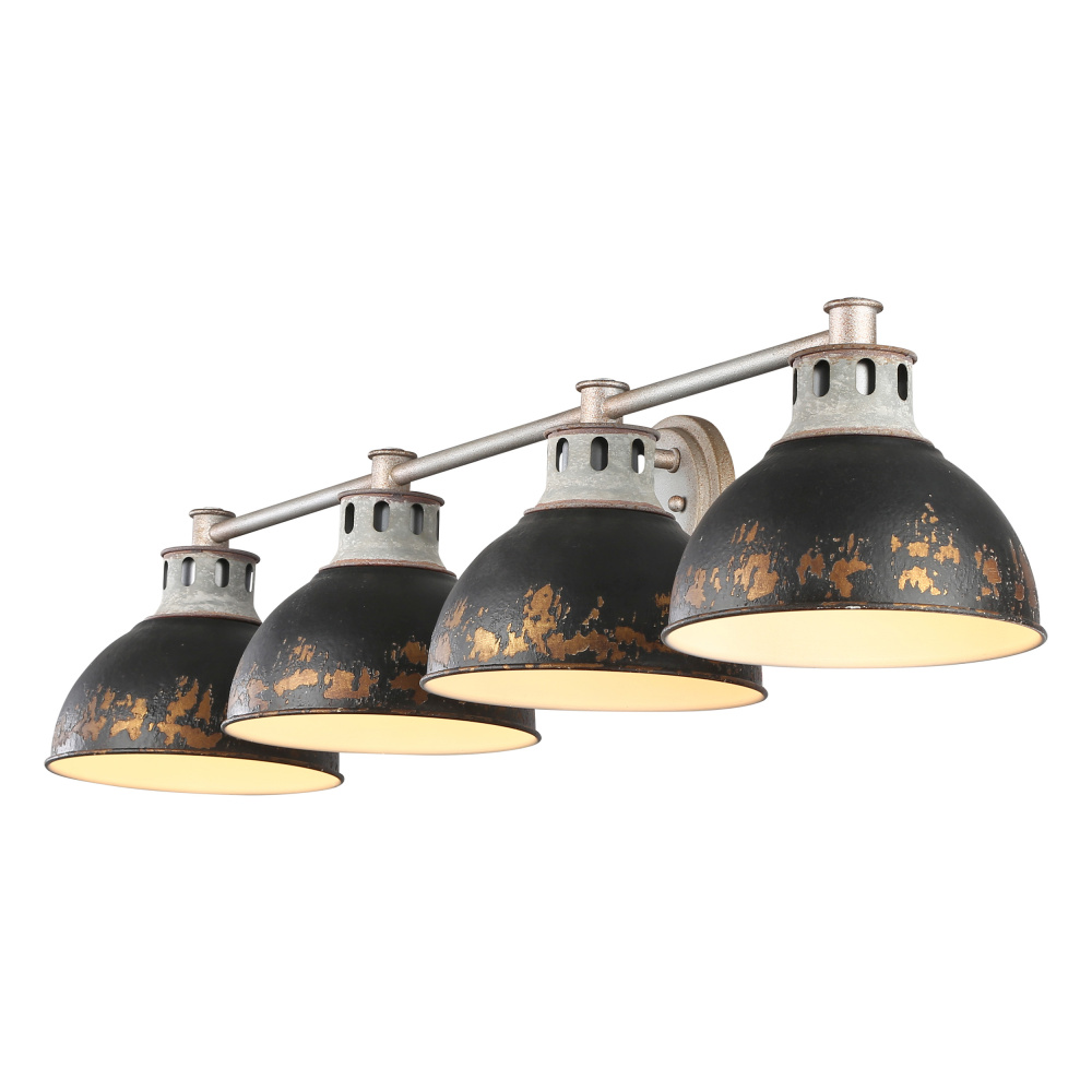 Bring traditional elegance into your home with the Golden Lighting Kinsley 4-light Vanity in Antique Black Iron shade. Featuring a metal shade and an Aged Galvanized Steel frame, it creates a welcoming atmosphere. The metal shade showcases a beautifully distressed Antique Black Iron finish, characterized by a matte, charcoal-black top coat that reveals a rugged, antiqued gold base beneath. The heavily textured surface enhances its authenticity, providing a charming vintage appeal. This light is damp location rated, making it perfect for bathrooms, covered porches, and laundry rooms. It requires 4 E26 Medium base bulbs (not included), with a maximum wattage of 100 per bulb, and the overall dimensions are 39.38"W x 7.88"H x 9.25"D. Elevate your space with this stunning fixture that emphasizes craftsmanship and character, making it a standout piece in any decor style.