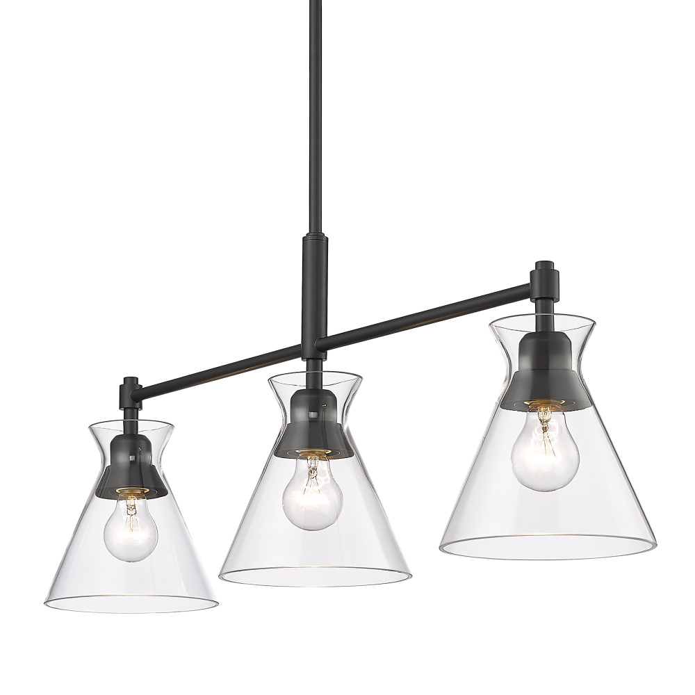 Bring modern elegance into your home with the Golden Lighting Malta 3-light Island Light in Matte Black. Featuring a glass shade and a matte black frame, it creates a welcoming atmosphere. The clear glass shade offers brilliant, unobstructed light, allowing the beauty of the bulb and fixture's design to shine. Its timeless appeal complements various styles, from minimalist to contemporary. The matte black finish is smooth to the touch, enhancing clean lines and adding sophistication to your décor. Tailored for kitchen islands, this fixture is Dry Location Rated, ideal for indoor spaces like bedrooms and living rooms. It is also sloped-ceiling compatible and has an adjustable height feature, making installation versatile and easy. Overall dimensions are 34"W x 13"H x 7.13"D, and it requires 3 E26 Medium base bulbs (not included), with a maximum wattage of 60 per bulb. Elevate your space with this stylish and quality light fixture, perfect for modern living.