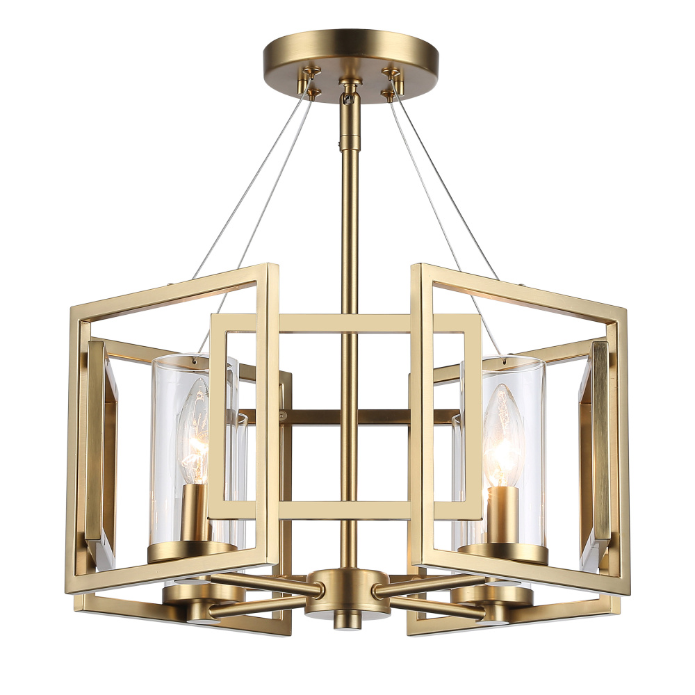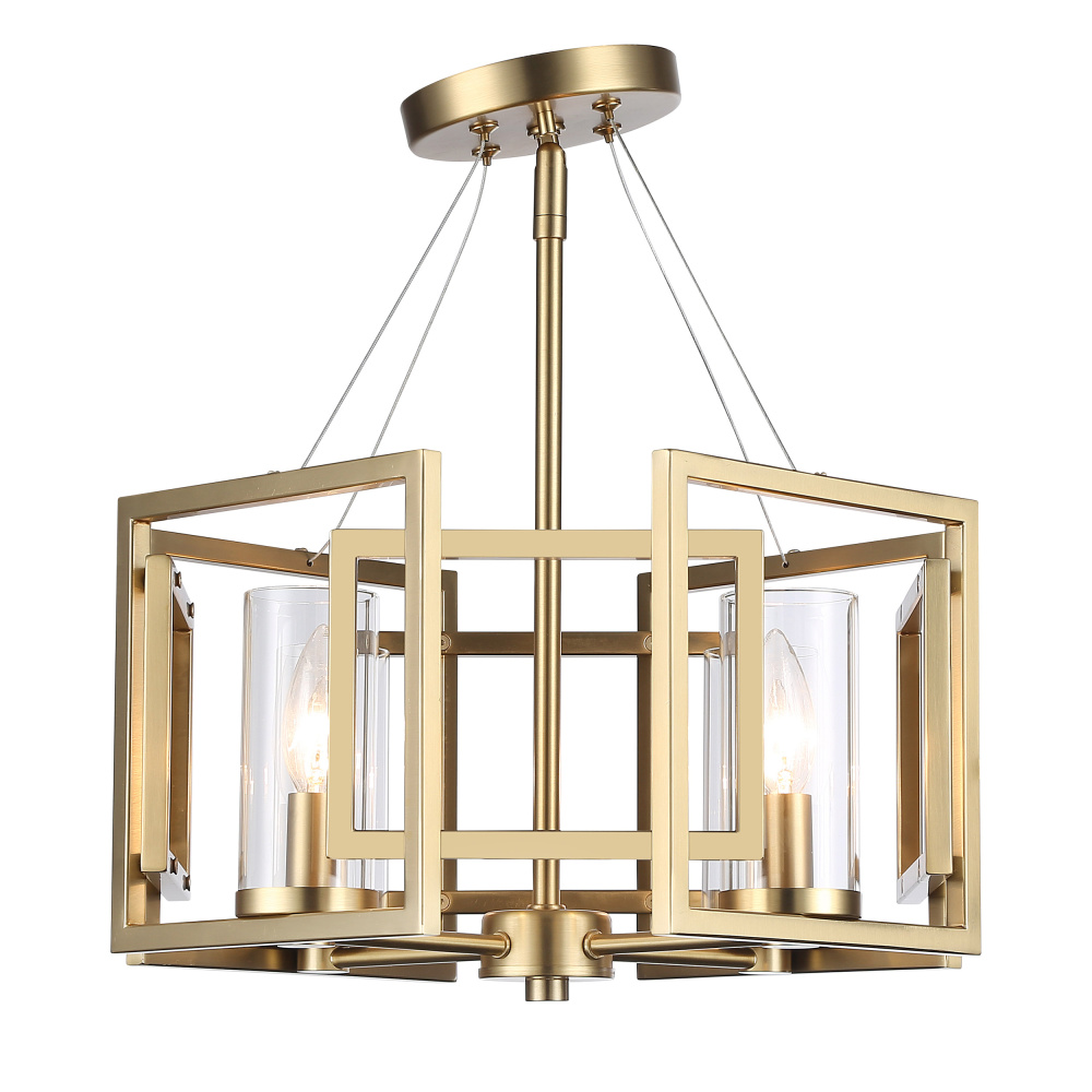 Elevate your home with modern elegance using the Golden Lighting Marco 4-light Semi-Flush Mount. Featuring a glass shade and a Brushed Champagne Brass frame, it creates a welcoming atmosphere filled with soft illumination. The clear glass shade offers brilliant, unobstructed light, beautifully showcasing the design of the fixture. With a smooth and polished finish, its timeless appeal complements a wide range of interior styles. The Brushed Champagne Brass finish is an understated, sophisticated color that catches the light perfectly, adding a touch of luxury to any room. This fixture is ideal for various spaces, including entryways, bedrooms, kitchens, and living areas with mid-height ceilings. It's Damp Location Rated, making it suitable for covered and semi-enclosed spaces with occasional moisture. The convertible design allows for adjustable height installation, making it versatile for sloped or flat ceilings. Overall Dimensions: 16"W x 10.63"H x 16"D. Requires 4 E12 Candelabra base bulbs (not included), with a maximum wattage of 60 per bulb. With its quality craftsmanship and stylish design, this semi-flush mount will enhance any interior with a blend of practicality and visual appeal.