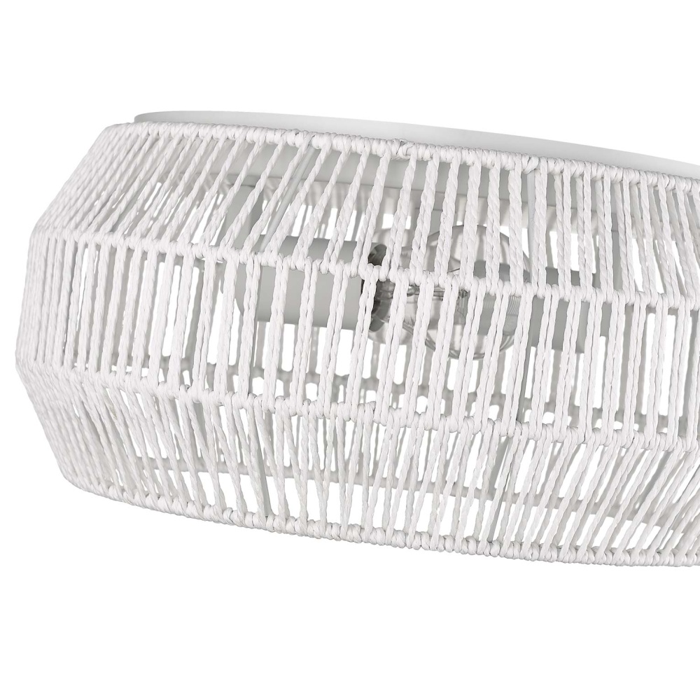 Bring Boho elegance into your home with the Golden Lighting Marlee 2-light Flush Mount. Featuring a Rope shade and a Matte White frame, it creates a welcoming atmosphere. The Bleached White Raphia Rope shade adds a highly textural and organic appearance, bringing a breezy coastal vibe to your space. The clean, bright shade complements the fixture's modern look, beautifully diffusing light. The Matte White finish is epitome of modern minimalism, enhancing the clean lines of the design. Its velvety surface absorbs light, creating an understated and sophisticated feel. Ideal for low ceilings in hallways, closets, laundry areas, bathrooms, and more, this fixture is damp location rated, perfect for covered spaces with occasional moisture. Overall Dimensions: 14.13"W x 6.5"H x 14.13"D. Requires 2 E26 Medium base bulbs (not included), max 60 wattage per bulb. Embrace natural beauty and artisanal quality in your home with this remarkable fixture.