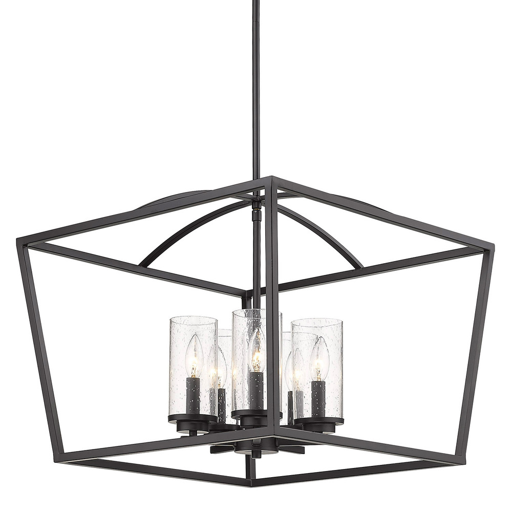 Introduce grand transitional elegance into your home with the Golden Lighting Mercer 5-light Chandelier in Matte Black. Featuring a glass shade and a matte black frame, it creates an inviting atmosphere in any space. The seeded glass shade, showcasing unique air bubbles, provides a beautiful diffusion of light that adds vintage charm to your décor. The matte black finish is versatile and timeless, making it suitable for a variety of interior styles. This chandelier is ideal for dry locations such as dining rooms and foyers, and it can be installed on sloped ceilings with an adjustable height from 20.5" to 62.5". With overall dimensions of 22.13"W x 17.5"H x 22.13"D, it requires five E12 candelabra base bulbs (60W max) to provide stunning illumination. Elevate your home with this exquisite fixture that merges sophistication with functionality.