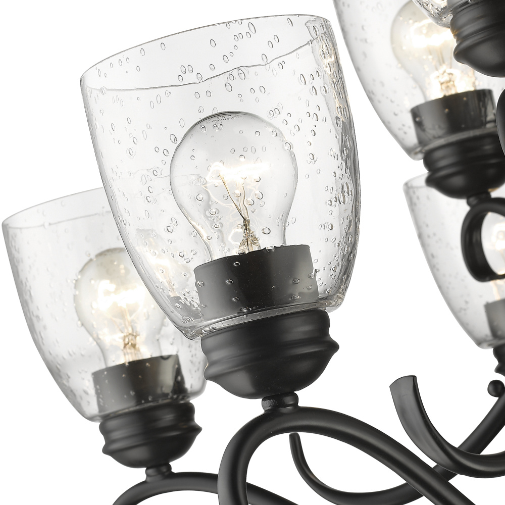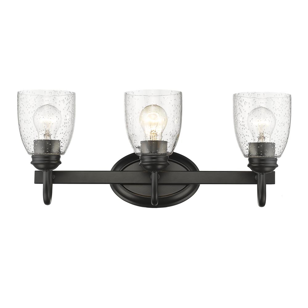 Bring modern sophistication into your home with the Golden Lighting Parrish 3-light Vanity in Matte Black. Featuring a glass shade and a matte black frame, it transforms your lighting into a stunning focal point. This glass shade showcases textured seeded glass, recognized for its small, infused air bubbles that create a distinctive vintage-inspired aesthetic. When lit, the bubbles catch the light beautifully, adding a refined sparkle and softly diffusing the bulb's glow for a warm, inviting ambiance. The matte black finish complements any decor, from minimalist and industrial to bold and contemporary, providing a timeless appeal. Perfect for brightening up bathrooms, this fixture delivers dedicated lighting that flatters and serves practical task needs. Damp location rated, it's suitable for covered and semi-enclosed areas subject to occasional moisture, such as bathrooms and laundry rooms. Overall Dimensions: 20.63"W x 8.5"H x 7.5"D. Requires 3 E26 Medium base bulbs (not included), max 60 wattage per bulb. Elevate your bathroom design with this stylish vanity light, embodying quality craftsmanship and contemporary elegance.
