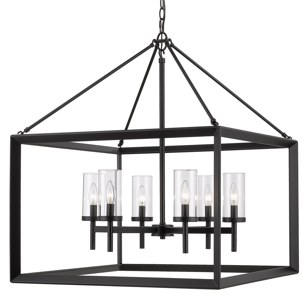 Elevate your space with Contemporary sophistication. Bring Modern elegance into your home with the Golden Lighting Smyth 6-light Chandelier. Featuring a glass shade and a Matte Black frame, it creates a welcoming atmosphere. The Clear Glass shade offers unobstructed light that enhances the beauty of the fixture. Its polished finish allows the design to shine through while providing bright illumination. The Matte Black finish is timeless and versatile, absorbing light and creating a soft, sophisticated look. Ideal for dining rooms and foyers, this chandelier is Dry Location Rated, ensuring safety in indoor spaces away from moisture. It's also Sloped-Ceiling Compatible and Adjustable in Height, accommodating various ceiling types and customizing the hanging length to suit your space. Overall Dimensions: 26.63"W x 30.75"H x 26.63"D. Requires 6 E12 Candelabra base bulbs (not included), with a maximum wattage of 60 per bulb. Style your home with quality craftsmanship and timeless design that makes a grand impression.
