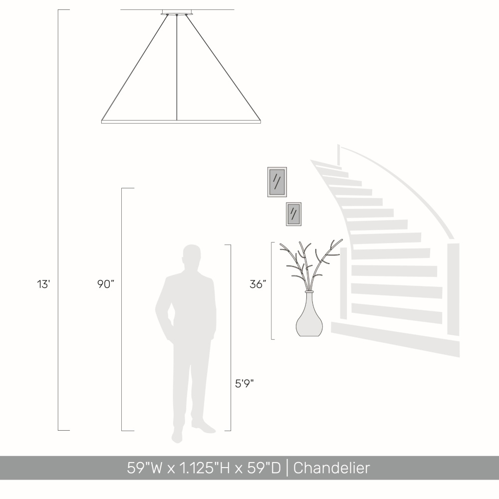 Bring modern elegance into your home with the Golden Lighting Veritas Integrated LED 59in Chandelier. Featuring a sleek design without any shade, this chandelier has a Sand Black finish that creates a bold statement in any room. This striking finish features a deep black hue with a non-reflective matte surface and a sandy texture, offering both visual interest and a touch that feels luxurious. Make a grand impression in dining rooms, foyers, or elevate bedrooms and living spaces with this stunning fixture, ideal for dry indoor spaces such as living rooms and hallways. Easily install it on sloped ceilings, and customize the hanging length to your desired height (30"-123"). Overall dimensions measure 59"W x 1.13"H x 59"D. Equipped with integrated LED technology, this chandelier provides 6525 lumens at a warm 3000K color temperature for an inviting atmosphere. Experience quality and sophistication with the Golden Lighting Veritas Chandelier.