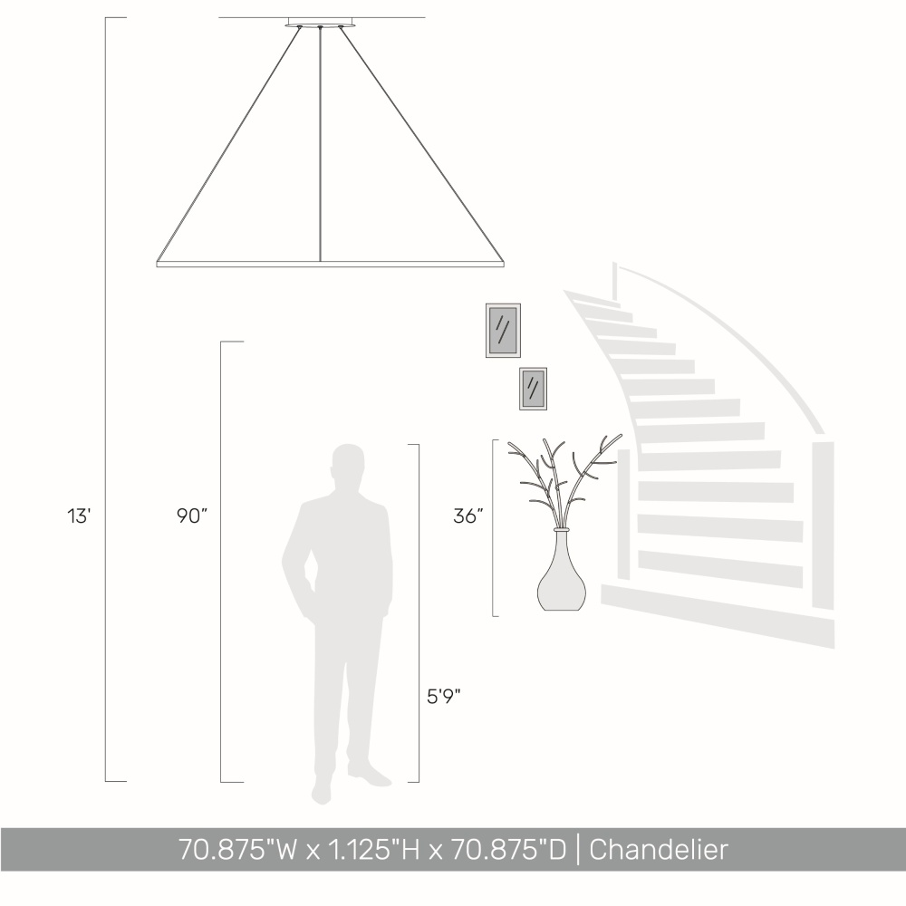 Bring modern elegance into your home with the Golden Lighting Veritas Integrated LED 71in Chandelier. Featuring a sleek design and a Sand Black frame, it creates a welcoming atmosphere. This chandelier showcases a minimalist form that is perfect for contemporary spaces. The integrated LED technology provides both up and down lighting, casting a balanced, ambient glow throughout your area. The Sand Black finish offers a sophisticated, non-reflective matte surface with a fine, uniform sandy texture. It absorbs light beautifully while adding a touch of high-end appeal to your decor. Ideal for dining rooms, living rooms, and hallways, this chandelier is perfect for dry locations. It’s sloped-ceiling compatible and adjustable in height, allowing for customization to fit your space. Overall Dimensions: 70.88"W x 1.13"H x 70.88"D. Enjoy brilliant illumination with integrated LED technology that delivers 7900 rated lumens with a warm 3000K glow. Elevate your home with quality and style.