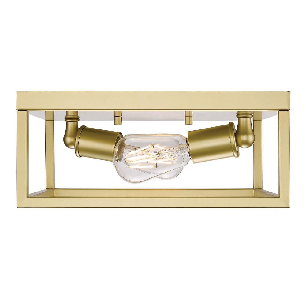 Bring contemporary warmth into your home with the Golden Lighting Wesson 2-light Flush Mount in Olympic Gold. Featuring no shade and a luxurious olympic gold frame, it creates a welcoming atmosphere for all spaces. The robust, open metal cage structure highlights the exposed bulbs, embodying the beauty of function with a modern twist. Our olympic gold finish offers a soft, pale gold hue with a creamy surface that diffuses light beautifully, elevating your decor with a chic touch. Ideal for low ceilings in hallways, closets, laundry areas, and bathrooms, this flush mount is damp location rated, making it suitable for areas with occasional moisture, like covered porches. It requires 2 E26 Medium base bulbs (not included), with a maximum wattage of 60 per bulb. Overall Dimensions: 12"W x 5"H x 12"D. This stylish design effortlessly blends into your decor while providing ample illumination and quality craftsmanship.