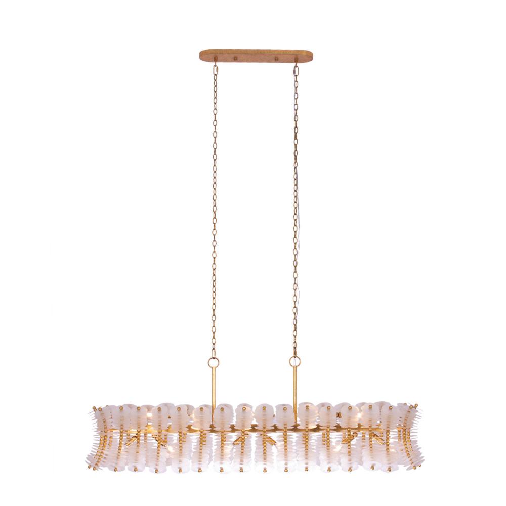 The Gossamer Collection was inspired by ruffled organza silk. Textures of layering flat pieces of raw Capiz Shell show the beauty of their natural edges and the wooden Gmelina bead spacers add structure and visual lines. This soft yet structured design is available in an Oxidized Gold Leaf finish and is equipped with 8 feet of chain.