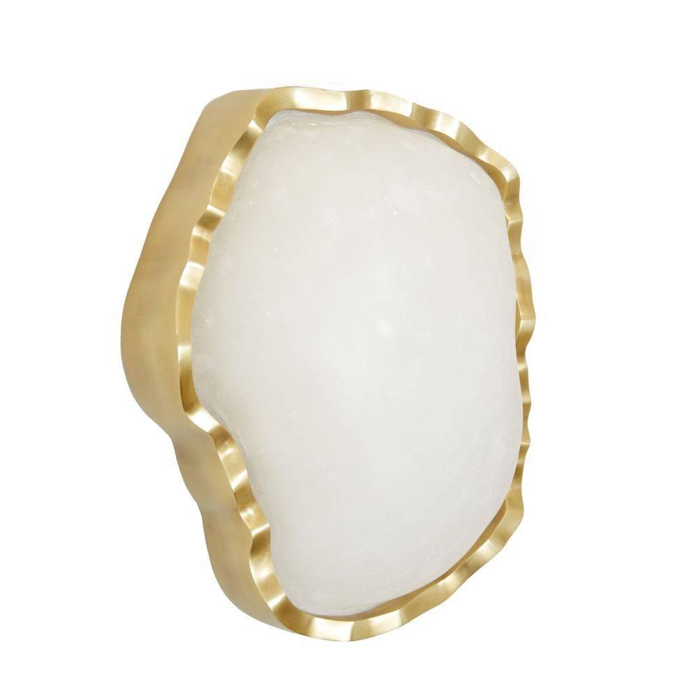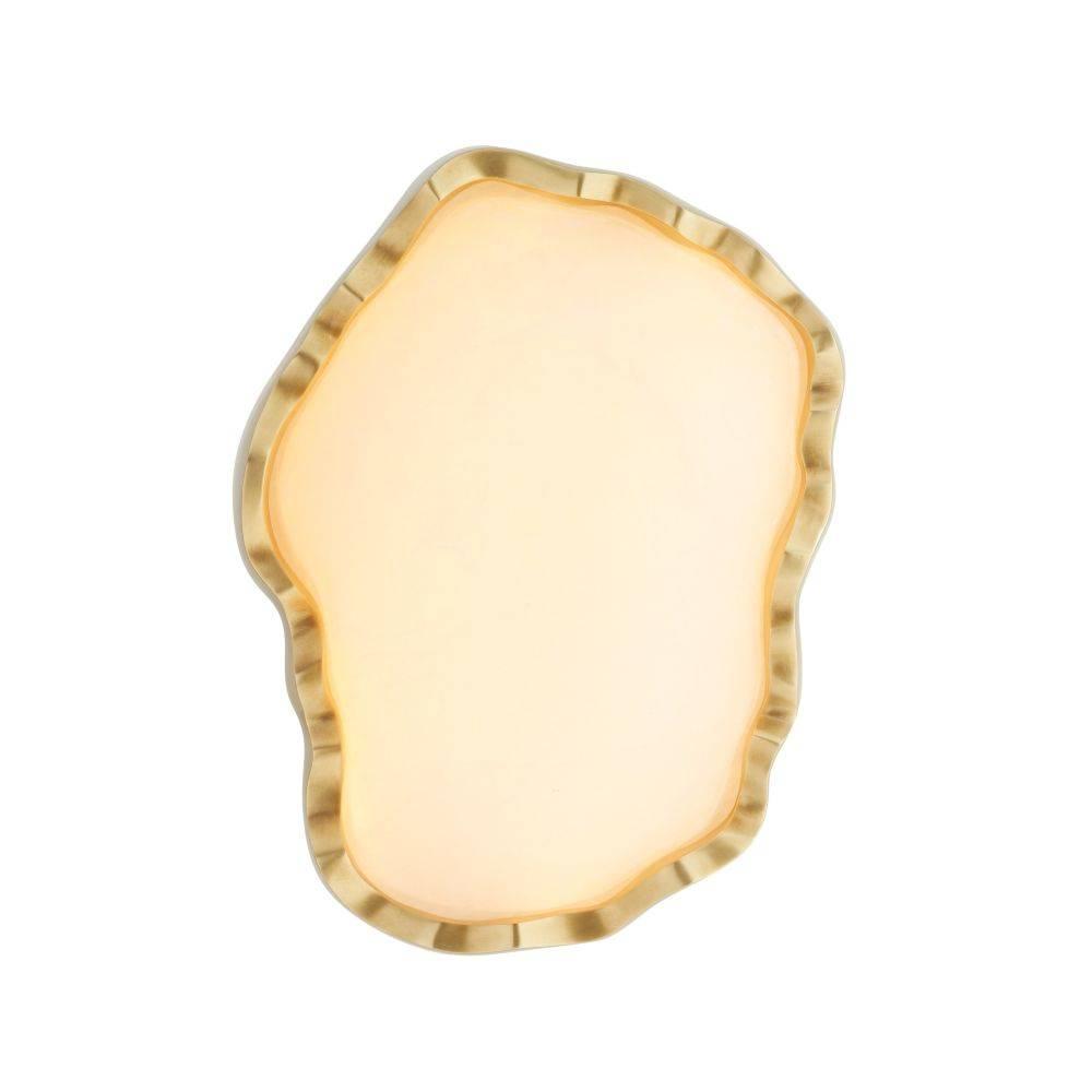 Like a shaped and polished cabochon, a freeform fixture of white alabaster is clasped in a setting of antique brass. Recalling a precious gem, this integrated LED fixture makes a stylish accent when paired or installed in multiples along a hallway. Damp-rated, although limited covered outdoor areas may affect finish. Finish will vary.