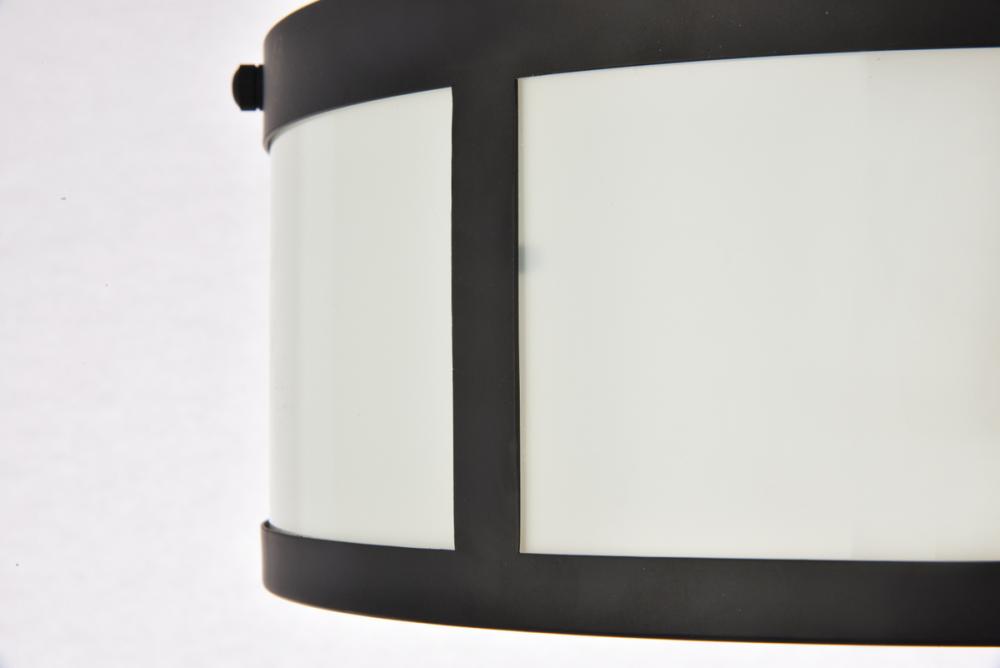 A no-nonsense design that blends seamlessly into a bedroom, kitchen, or office décor, Hadrian collection flush-mount fixtures get the job done while providing a soothing ambiance. A cylindrical steel frame in a flat-black finish gives a pleasant contrast to the curved frosted white glass exterior and circular shade. A matching endcap in the center of the shade and studded accents along the top of the frame add additional personality to the overall look.