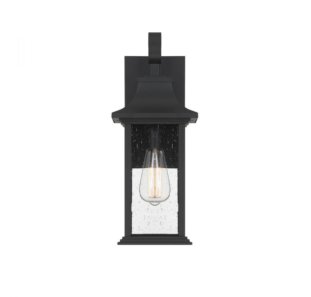 Create a stylish first impression outside your home with this Savoy House Hancock 1-light outdoor wall lantern. Crafted in a timeless classic style, it features a boldly sloped roof, shepherdï¾’s hook detailing and panes of clear seeded glass that ensures a beautiful, dramatic glow. A generously sized backplate helps to cover any holes left from replacing previous fixtures and the versatile black finish means that Hancock goes well with anything. Use this lantern beside your front and side doors or above your garage door. This fixture is 6.75" wide and 17.5" tall. It extends 7.5" from the wall.Uses one standard size light bulb of up to 60 watts (not included).