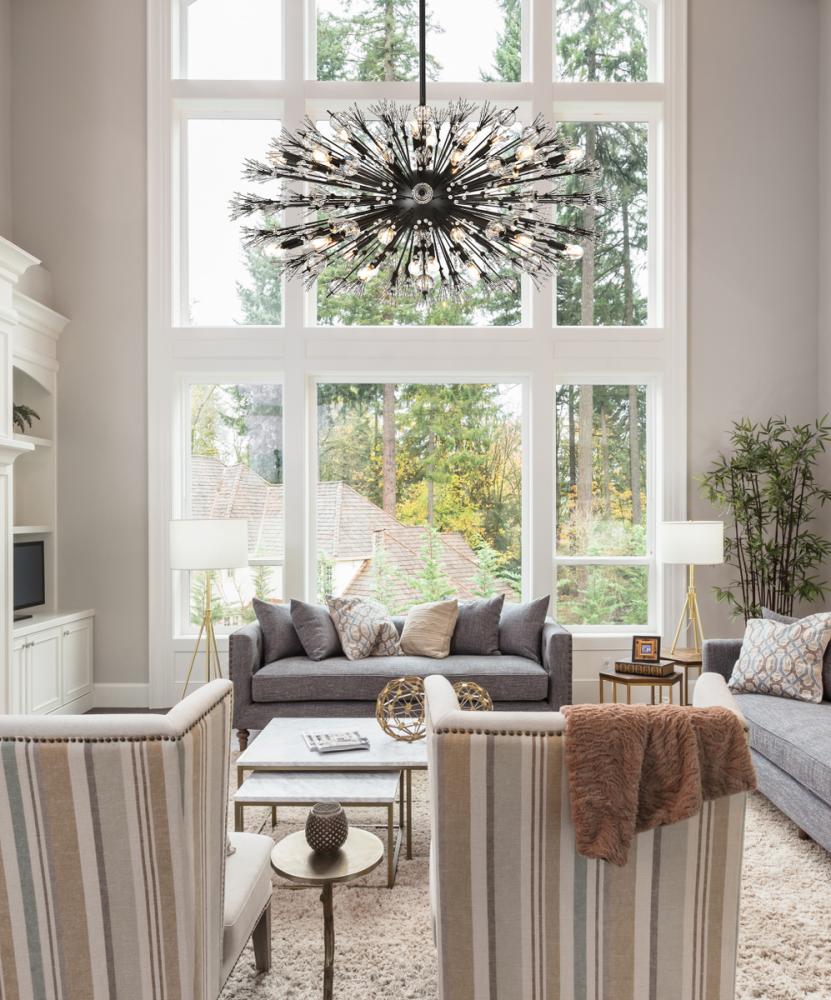 Features a striking sputnik-style shape with sparkling crystal accents for a luxurious modern touch.