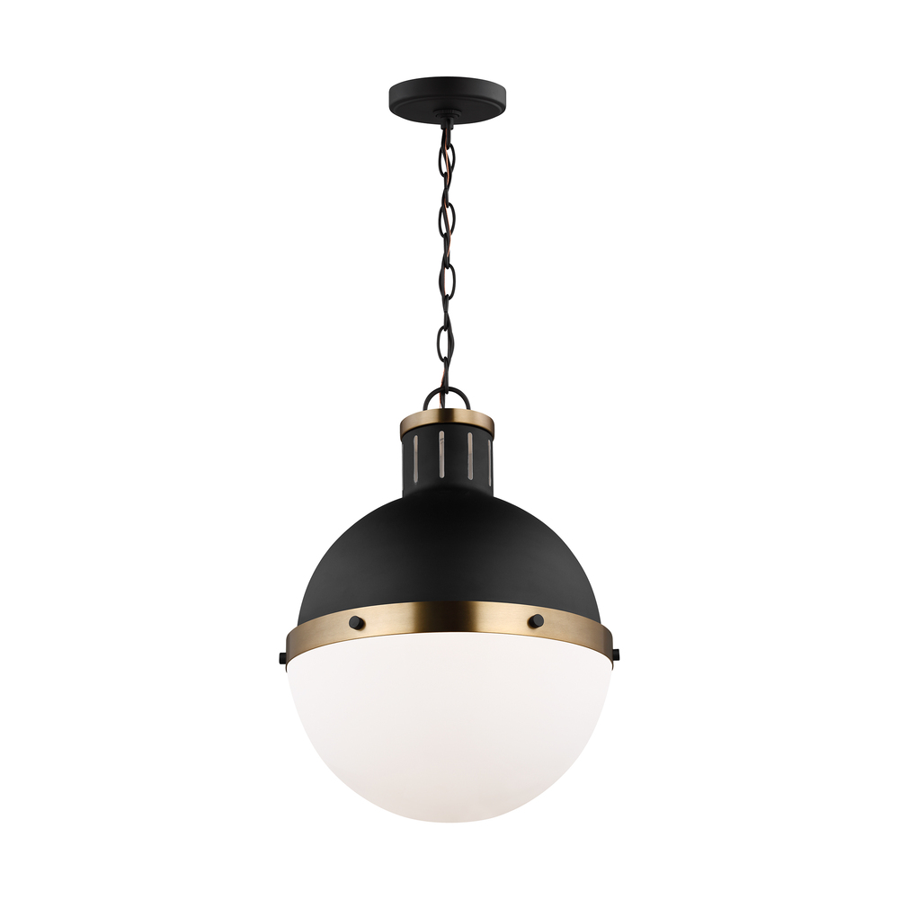 The Hanks medium modern pendant is offered in the Midnight Black/Satin Bronze, Antique Brushed Nickel, Satin Bronze, or Brushed Nickel finish. This globe style pendant is crafted with an antique finish and white glass shade, offering an approachable style with direct lighting. The multiple use of color and finishes exude mid-century modern style to help entice any updated space.