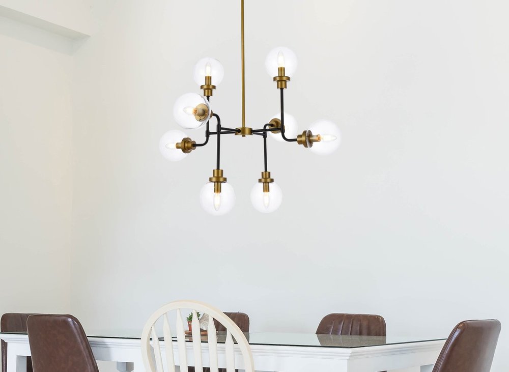 Hanson 8 lights pendant in black with brass with clear shade is the perfect fixture for over a kitchen island, over a dining table, or use in any room to make a big statement. This pendant elevates the look of any space.