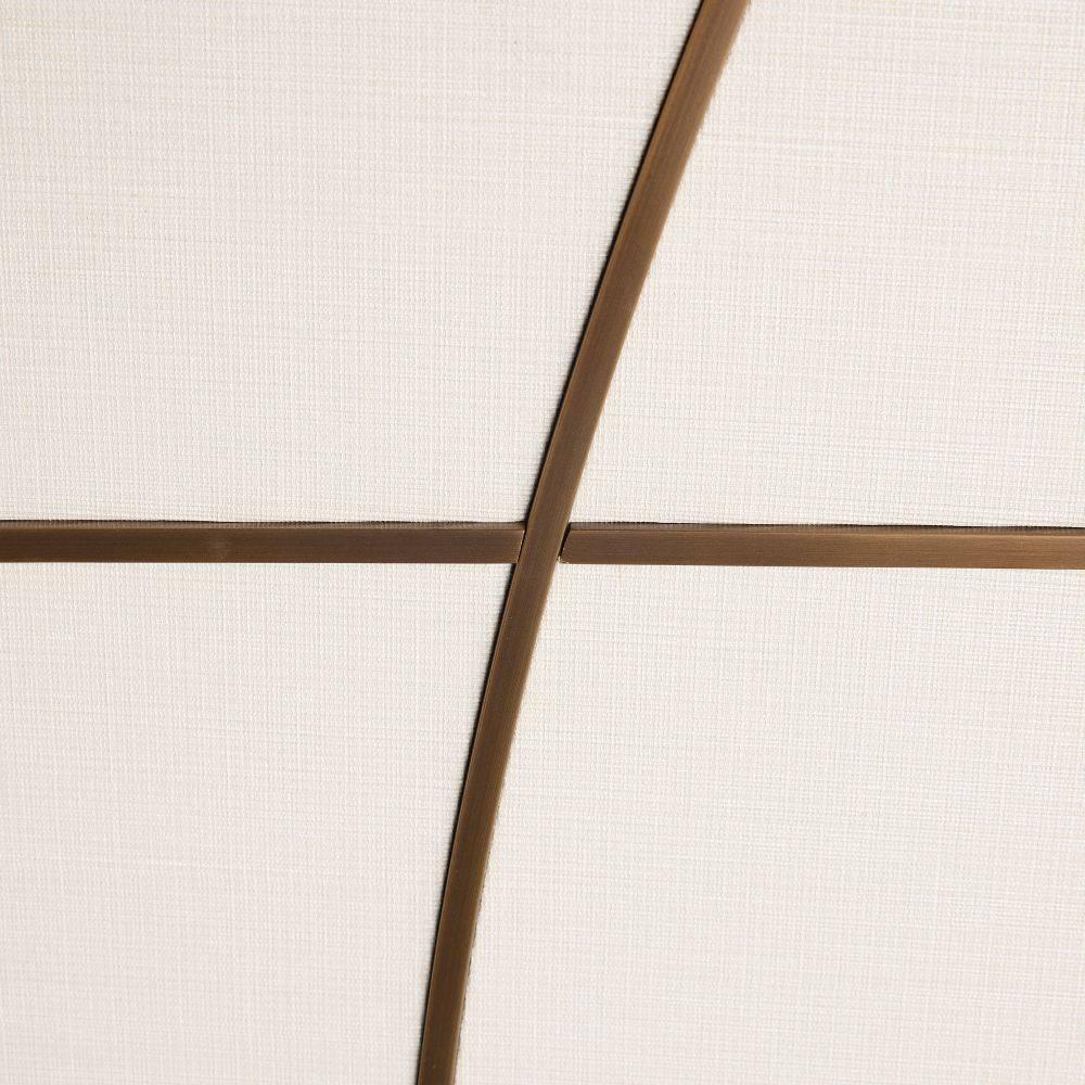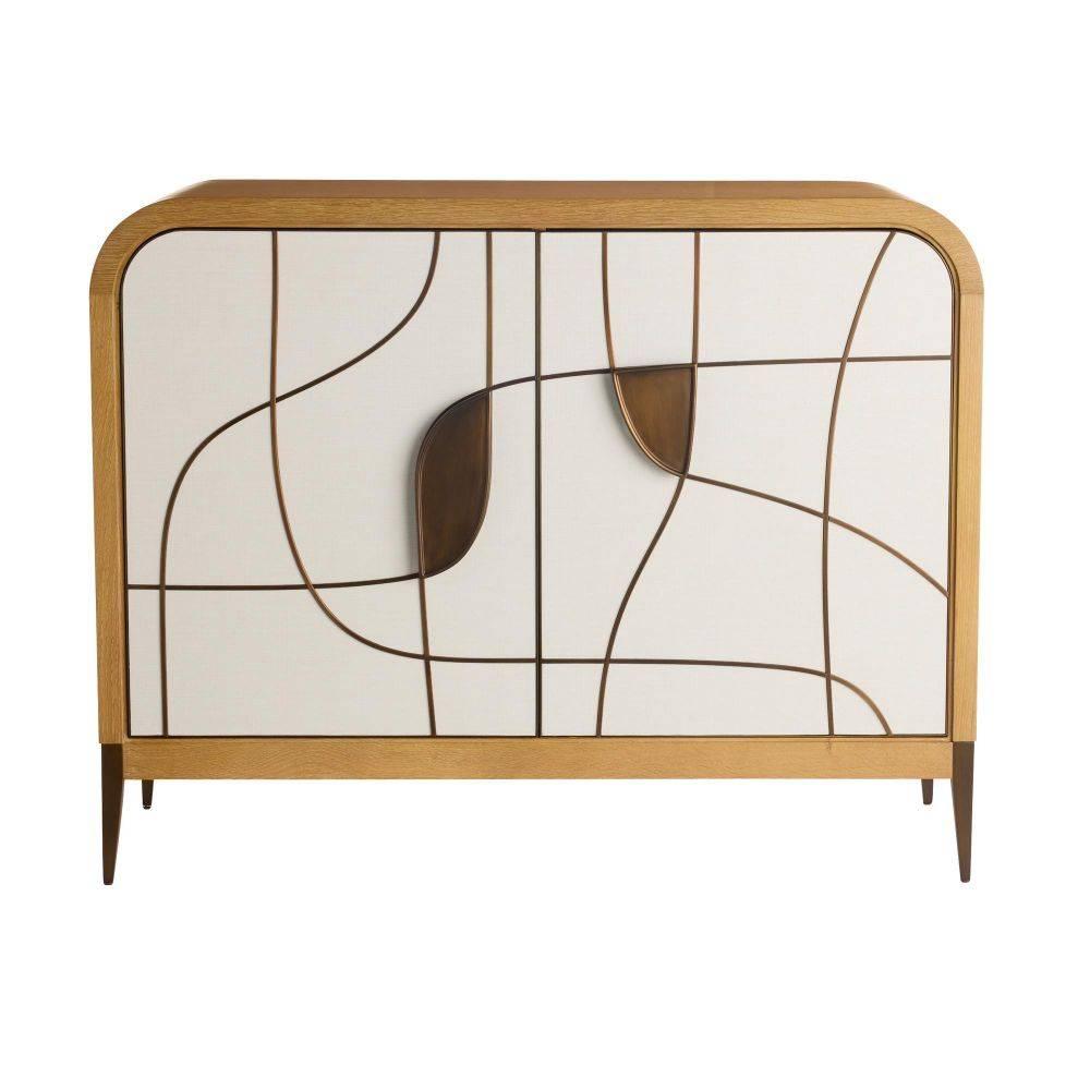 This handsome buffet-style cabinet delivers both style and function. Set within the waterfall veneer frame of oyster oak, panels of beige seagrass cloth are bracketed by linework in a playful pattern of heritage brass. Inspired by modernist sculpture, the integrated custom heritage brass hardware pulls have a tactile groove for easy opening. Inside lies a single adjustable shelf.