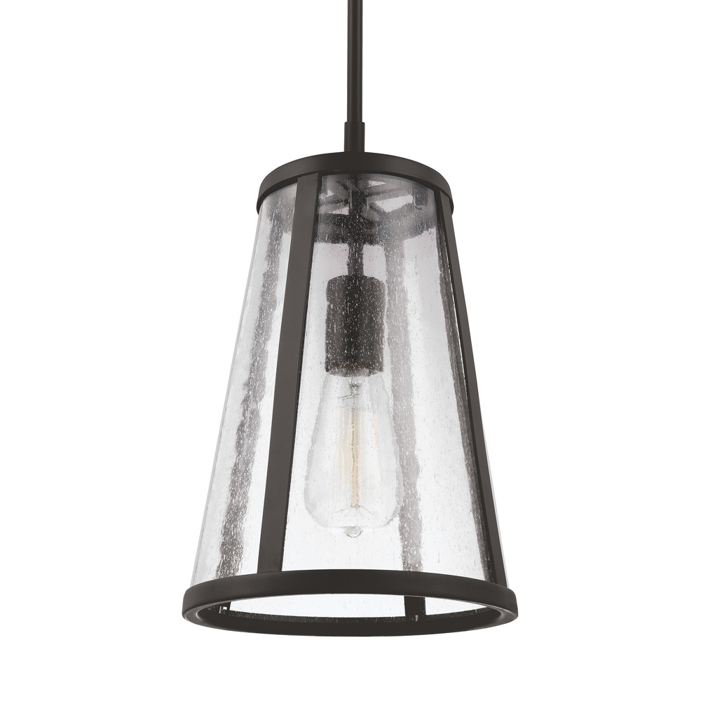 Combining the traditional profile of a tapered shade with on-trend Clear Seeded glass, the sleek frame and the square-linked chain give the Harrow pendant light collection an elevated, contemporary, transitional look. The wall sconce is delivered with two glass options, Clear Seeded and Opal Etched, for the customer's choice to customize. Burnished Brass, Oil Rubbed Bronze, and Polished Nickel finishes are available to create completely different looks.