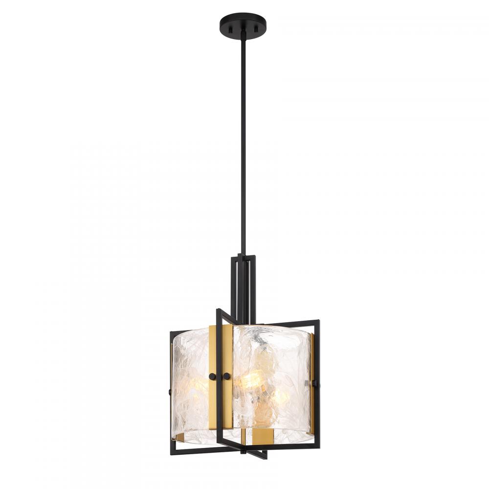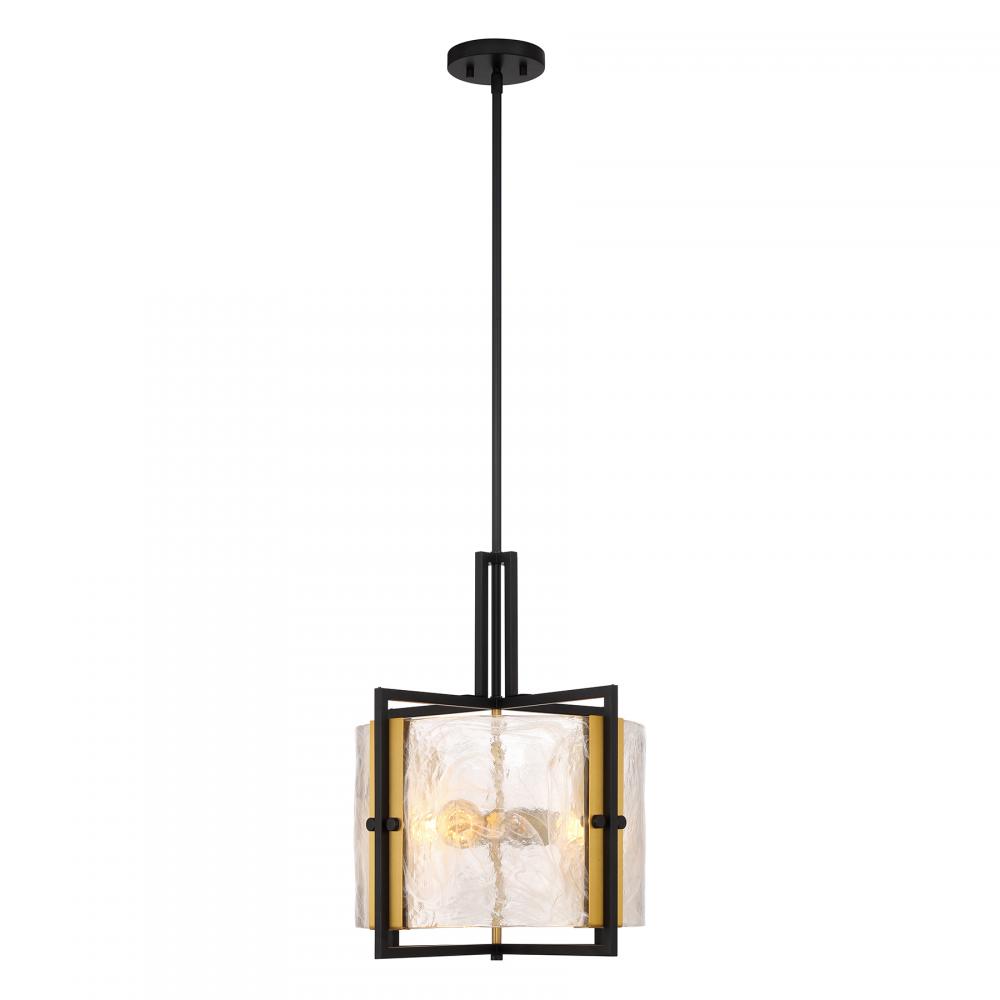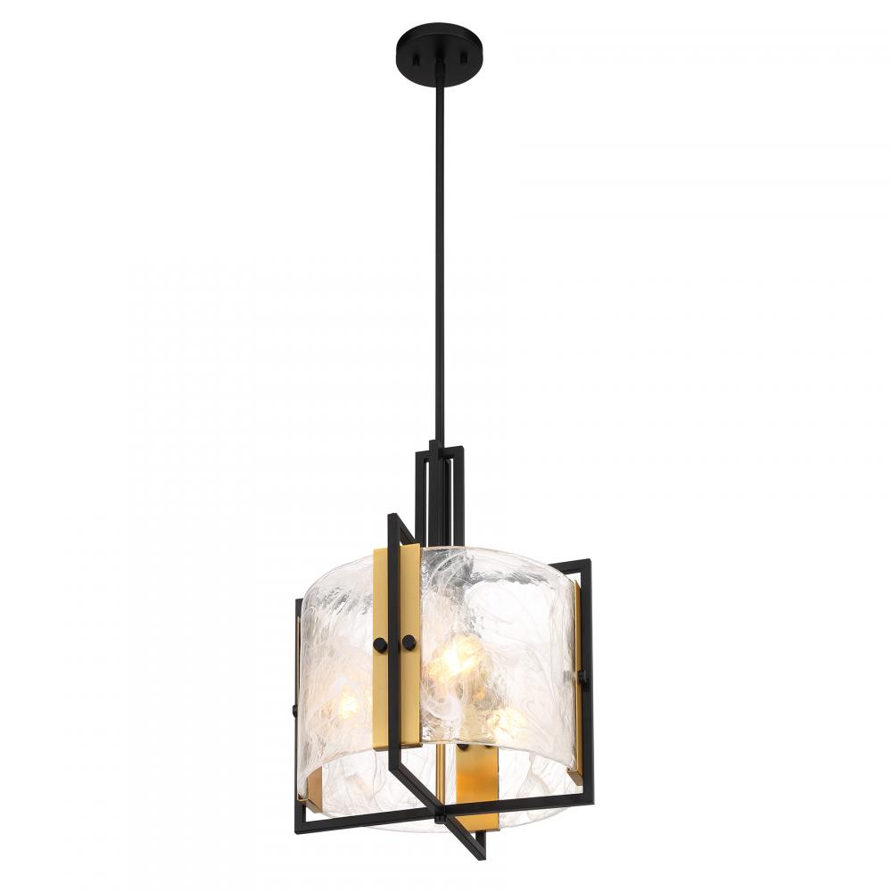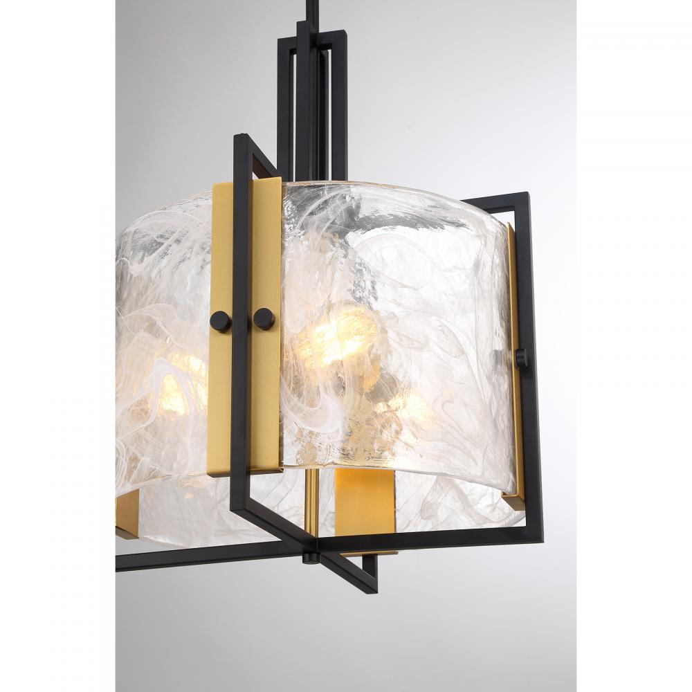Swirling, mesmerizing strie piastra glass surrounds the lights within the Savoy House Hayward 3-light pendant. The Matte Black frame showcases Warm Brass accents for another dimension of style. Hayward is 16" in width and has an adjustable height ranging from 20" to 74". Comes with four 12" downrods and one 6" downrod. Uses three standard size bulbs of up to 60 watts per bulb. Bulbs are not included.