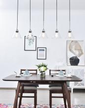 - Chrome finished 5-light pendant light with cone glass shade suspended from a rectangular canopy