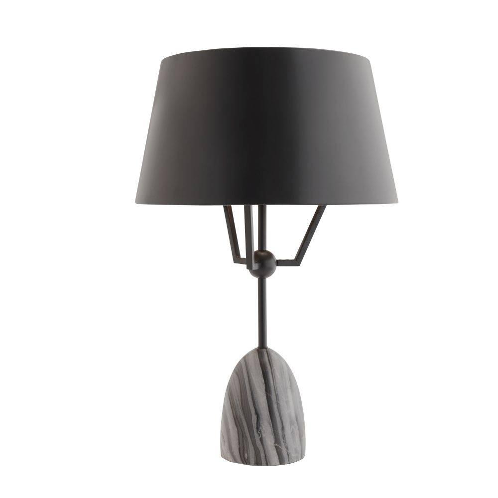 Like a figure holding up its arms, this playful style of bronze-plated iron seemingly "lifts" its sleek metal shade to disperse light. A rounded base of galaxy marble juxtaposes the fixture's industrial edge. Matching finial. Finish will vary.