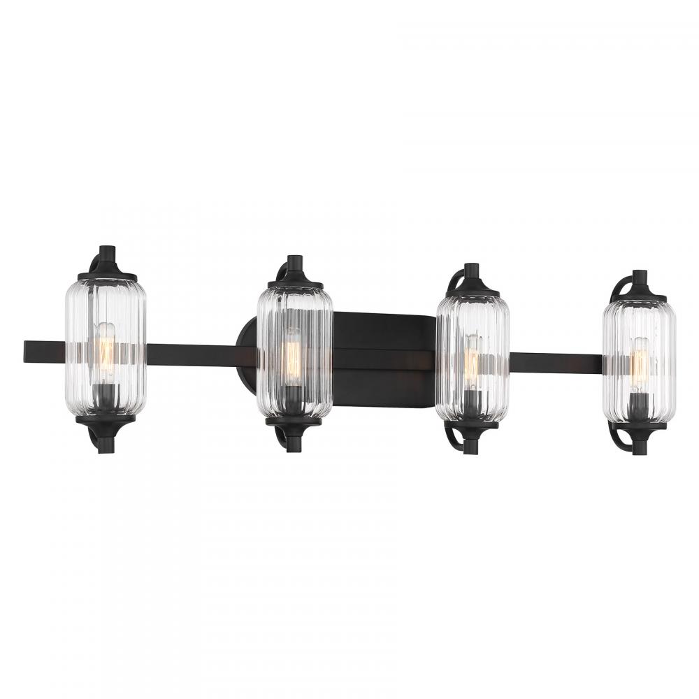The Savoy House Holton 4-light bath light showcases an inventive and geometric style with tall, rounded shades of clear ribbed glass and a slim, rounded structure finished in Black. It will bring a big dose of style to any bathroom! Holton is 9" in height, 32" in width and extends 6.75" from the wall. It uses four candelabra size bulbs of up to 60 watts per bulb. Bulbs not included. Install as shown. This bath bar is damp area rated.