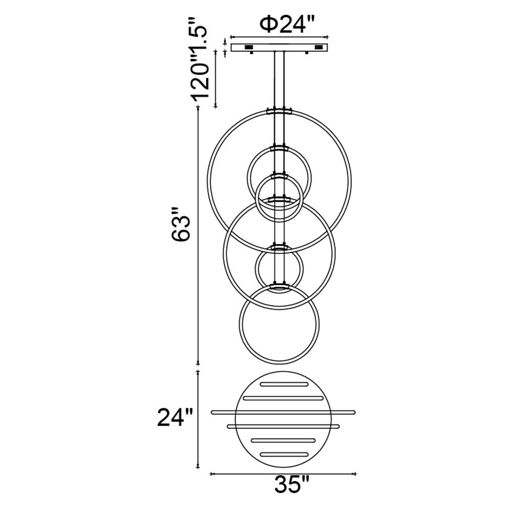 Bring dynamic style and architectural elegance into your space with the Hoops 35'' 6-Light LED Chandelier in Black. This sculptural light fixture features six LED-lit hoops suspended at varying heights, creating a dramatic interplay of light and form. The black-finished hardware and sleek silhouette make this chandelier the perfect focal point for modern interiors. Whether used in a high-ceiling entryway, over a large dining table, or in a grand living space, this energy-efficient chandelier elevates ambiance while delivering efficient illumination. Finish: Matte Black Light Count: Integrated LED (6 Rings) Light Source: LED, No Bulb Required Adjustable Hanging Height: Yes Material: Metal and Acrylic Style: Modern / Contemporary / Sculptural