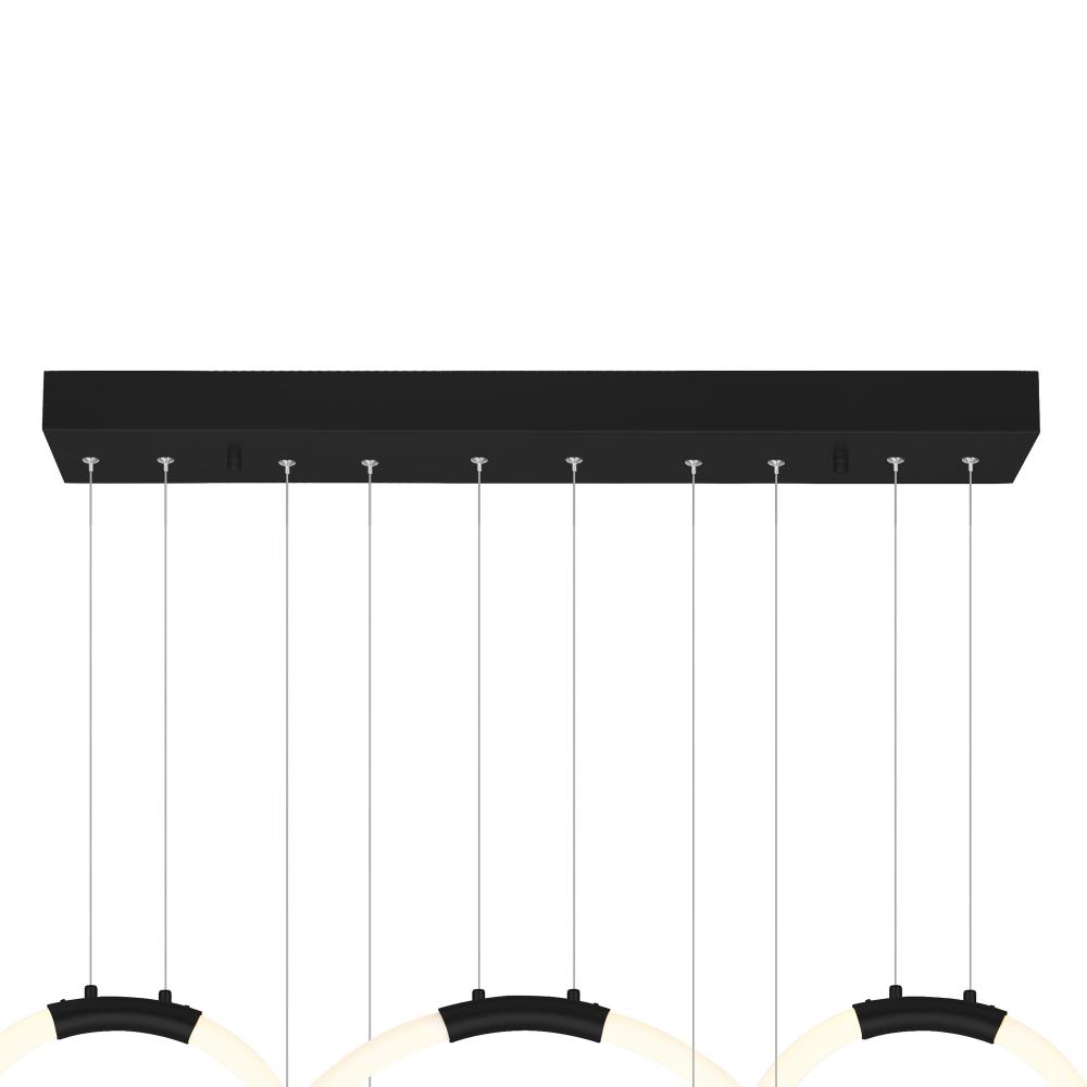 Make a bold lighting statement with the Hoops 44'' 5-Light LED Chandelier in Black. Designed for modern interiors, this multi-ring pendant fixture showcases five integrated LED rings cascading at varying heights from a minimalist rectangular canopy. The matte black finish offers dramatic contrast, while the suspended circular design provides architectural interest without overwhelming your decor. Whether in a double-height foyer, stairwell, or expansive dining space, this chandelier brings both brilliance and style to your home. Finish: Matte Black Light Count: Integrated LED (5 Rings) Light Source: LED, No Bulb Required Adjustable Hanging Height: Yes Material: Metal and Acrylic Style: Modern / Minimalist / Architectural