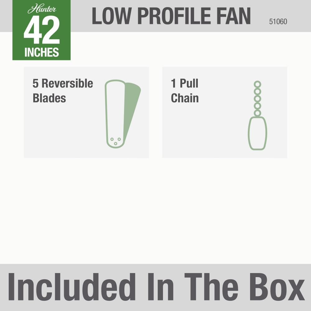 The Hunter Low Profile? IV traditional ceiling fan is designed with housing specially crafted to fit flush to the ceiling making it ideal for use in your small rooms with low ceilings. Available in multiple finishes, this low-profile ceiling fan without light is powered by a three-speed WhisperWind? motor to deliver ultra-powerful and whisper-quiet performance making it the perfect complement for your casual living rooms and bedrooms.